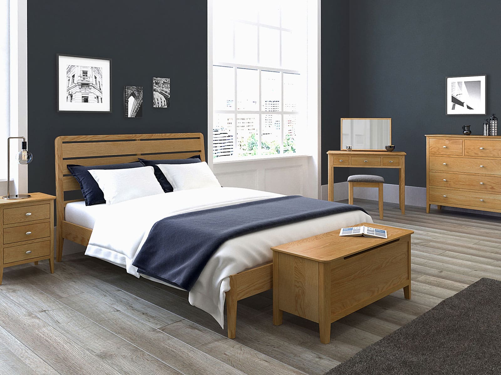 This range is a relaxed modern oak bedroom collection, exuding elegance defined by clean lines & gentle curves. The collection has been finished in a natural lacquer, which gives the tops durability. Bath has an offering of 3 different bed sizes, 2 sizes of bedsides, 2 sizes of chests and 2 sizes of wardrobes providing plenty of stylish and flexible bedroom storage.