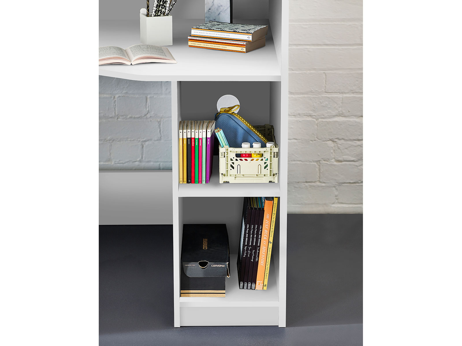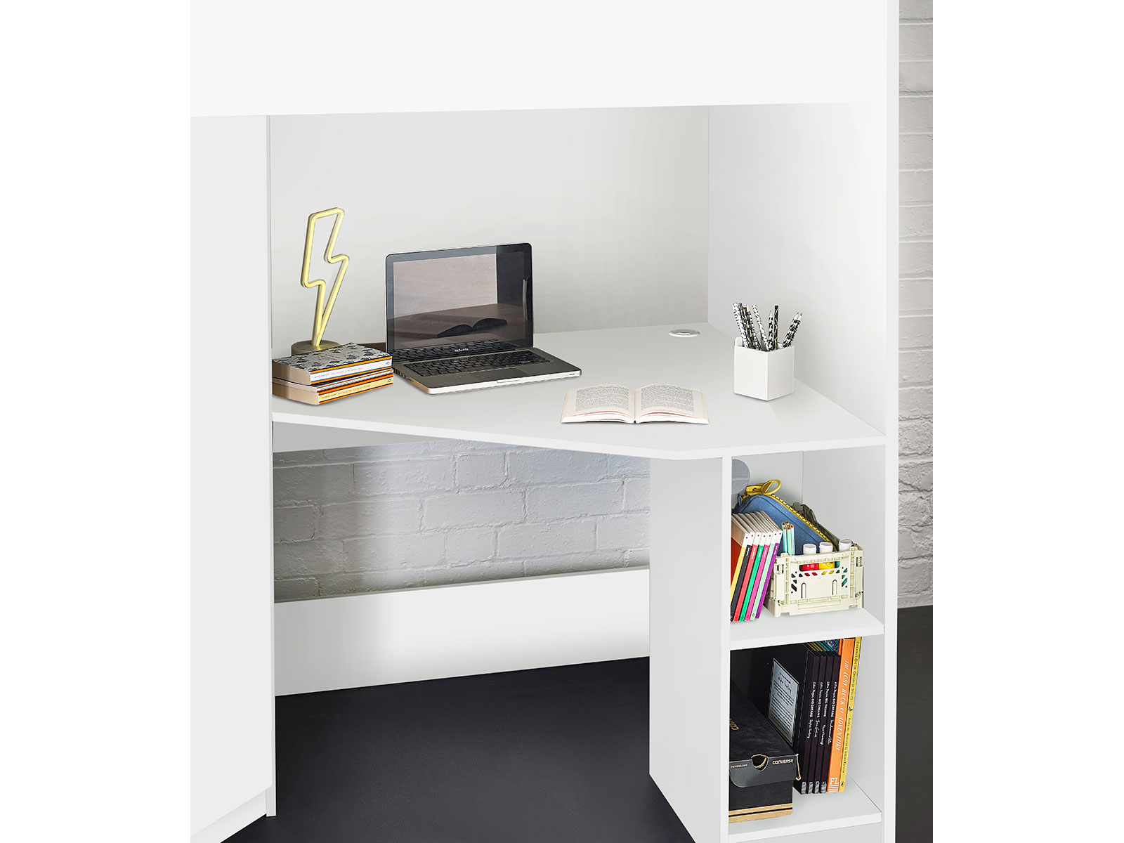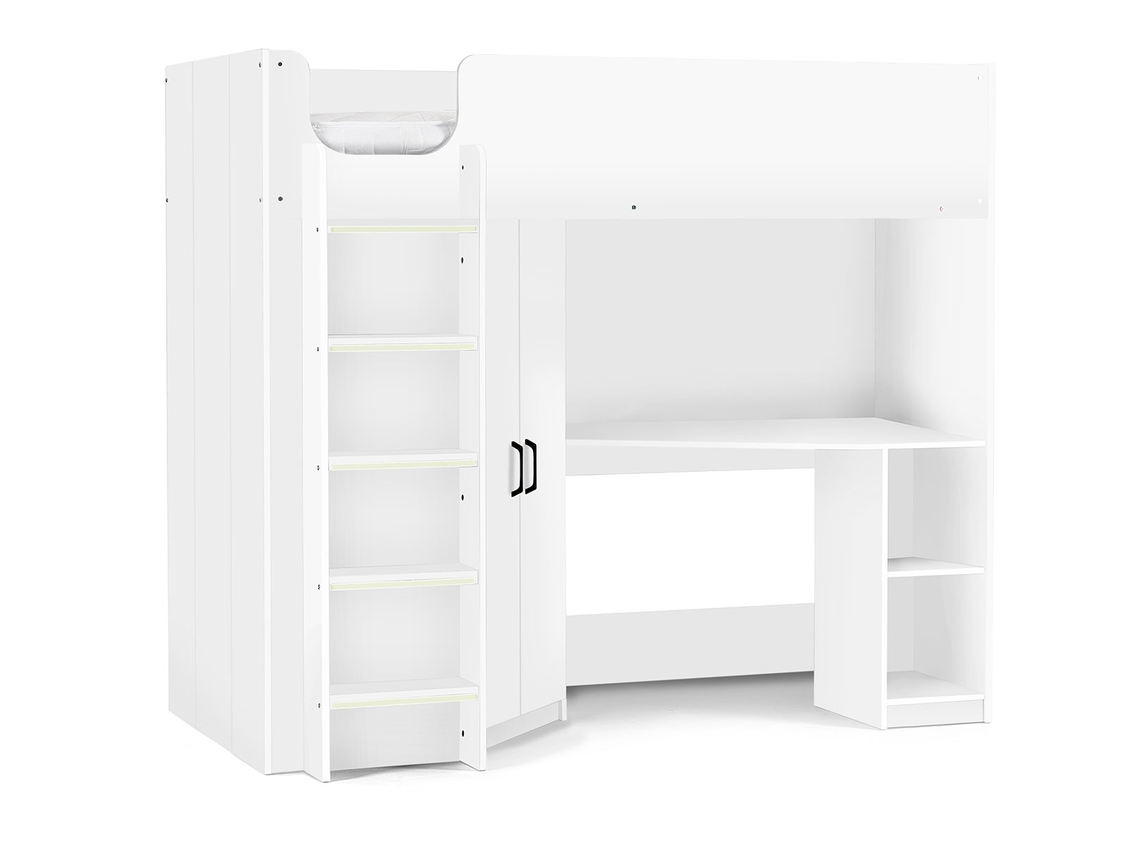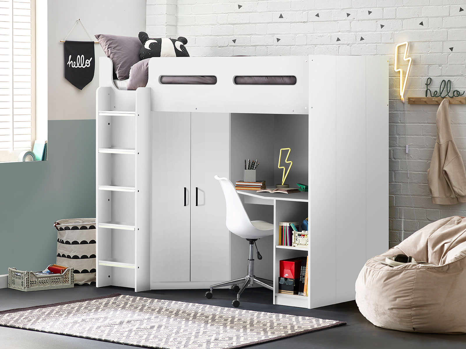 Designed with perfect functionality, the Hercules Highsleeper is the ultimate bed for your child. The angled wardrobe provides ample space for clothing, whilst the built-in shelving is great for all their files, folders, trainers, or games to stay organised. With glow-in-the-dark steps, and colourways of woodgrain and anthracite, white, and anthracite, there is an option for any interior style.