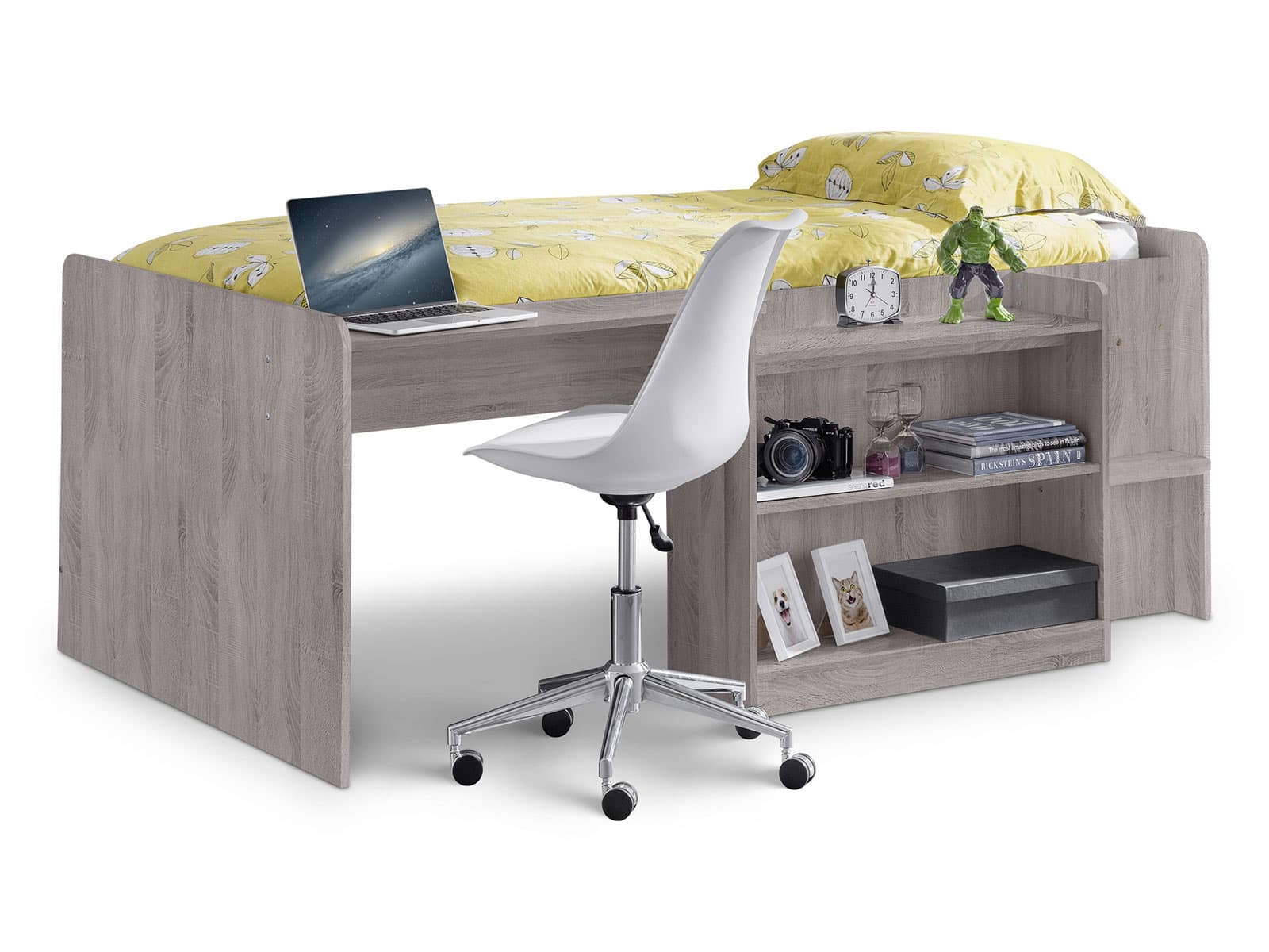 The Neptune Midsleeper offers a compact space saving design with a fresh and minimalist look in a Grey Oak finish, suitable in both boys and girls bedrooms. Featuring a desk and 2 large shelves, along with additional underbed storage to free up some floor space for books, toys and more. Crafted from sturdy particleboard with foil, this bed has a wooden slatted base and fits a UK single mattress