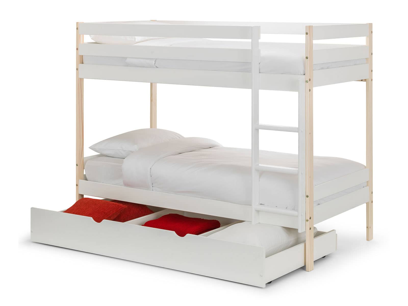 The Nova Bunk offers a classic design in a 2-tone white and pine finish. Perfect for sharing siblings or sleepovers, the Nova valuable activity space by only taking up the room of a single bed, ideal for smaller bedrooms. Crafted from solid pine and MDF, this sturdy design suits any styles of interior. Pair up with the Nova Trundle for additional storage space or an extra bed for sleepovers that can be stored under the bunk neatly when not in use. (Trundle Sold Separately)