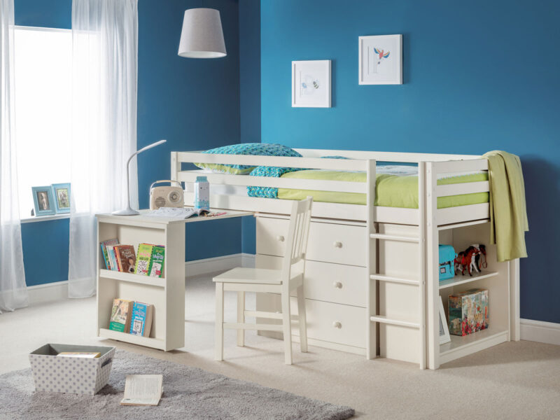 Roxy is an extremely clever and practical piece of children’s furniture that offers incredible functionality and great value for money. Roxy’s compact footprint is supported by a robust, solid pine framed construction and offers numerous useful features from a handy pull-out desk to ample shelving and cupboard space. Immaculately finished in a smooth stone white lacquer, Roxy comes with two choices of handle in either traditional painted wood, or a contemporary brushed steel finish. Roxy is the perfect accompaniment to Julian Bowen’s Cameo range of bedroom furniture in a matching stone white finish.
