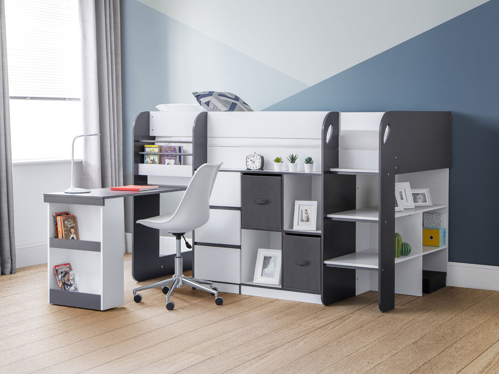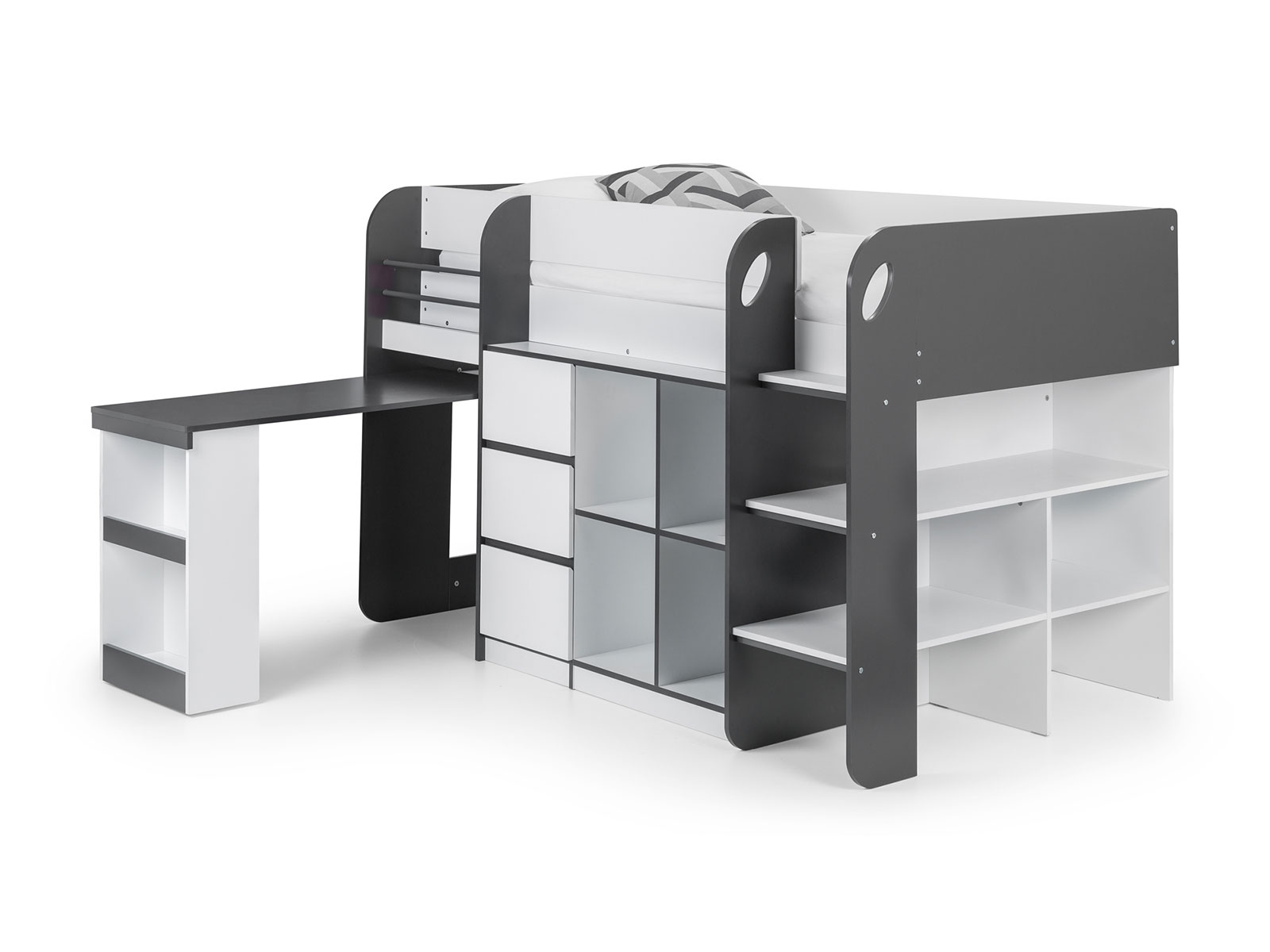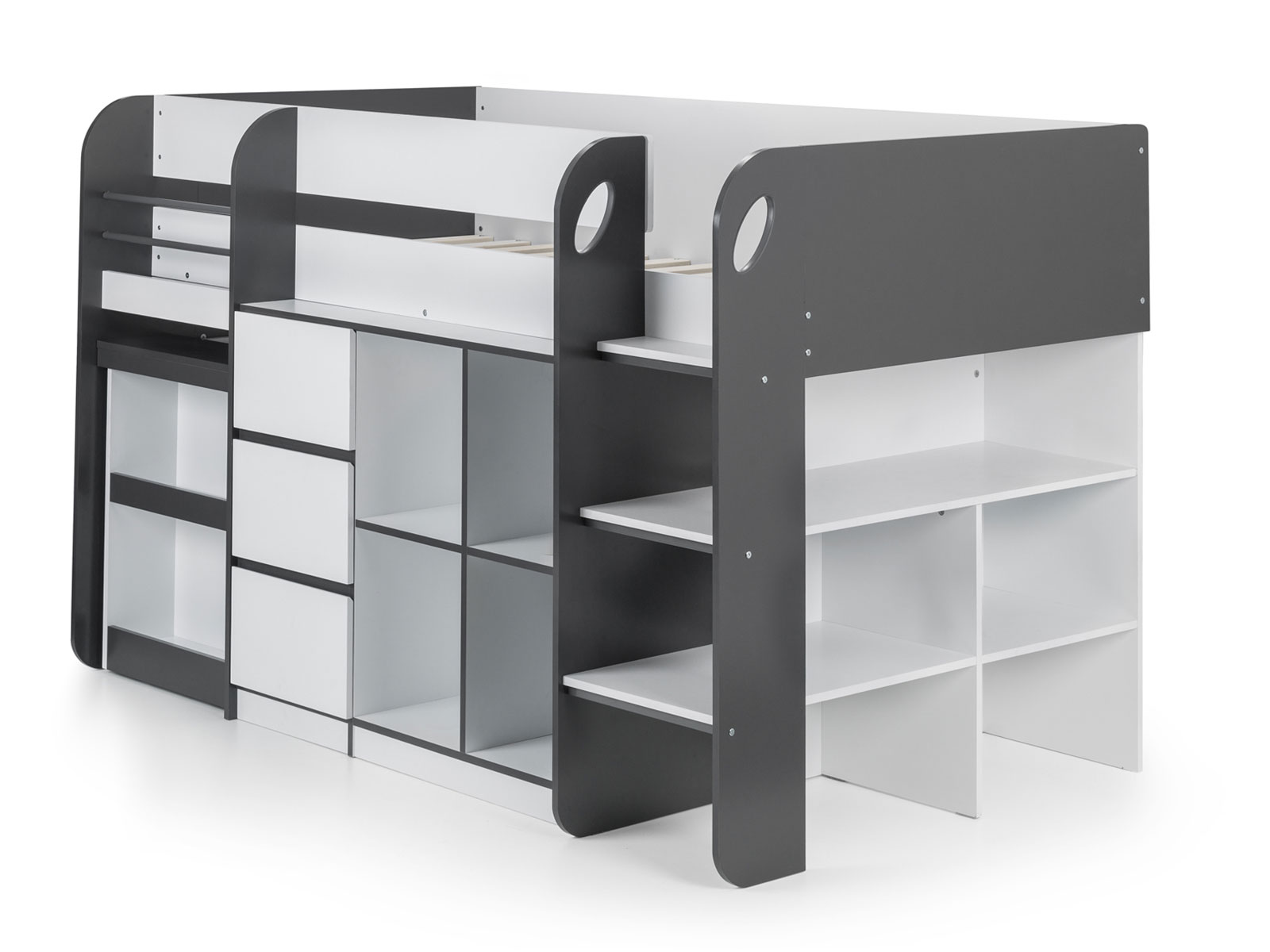 Offering a compact, space saving design, the Saturn Midsleeper features a bookcase, 3 drawer chest, and a cube bookcase saving floor space for toys and more. Finished in a modern charcoal grey and white, this midsleeper is perfect for a wide range of childrens bedroom decor. Crafted from sturdy particleboard, this bed has a wooden slatted base and fits a UK single mattress.