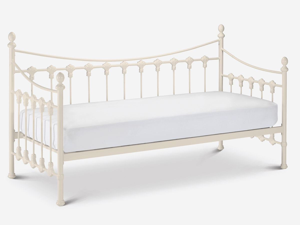 An elegant interpretation of a great classic design offering a full 90cm sleeping or sitting space. Finished in a stone white eggshell textured lacquer and incorporating a sprung slatted base for aded comfort and prolonged mattress life. Versailles is a beautiful daybed that fits beautifully in any setting, from living room to conservatory, as a functional guest bed and even as a charming children’s bed.