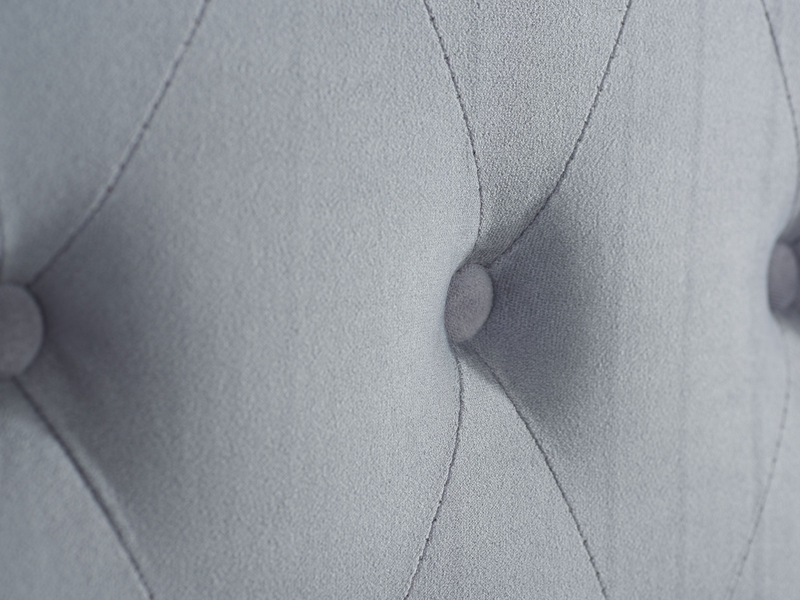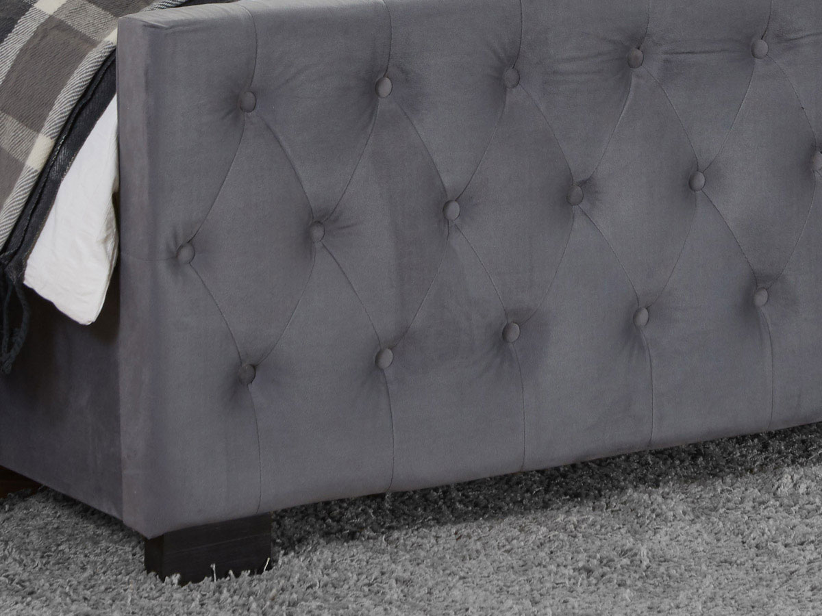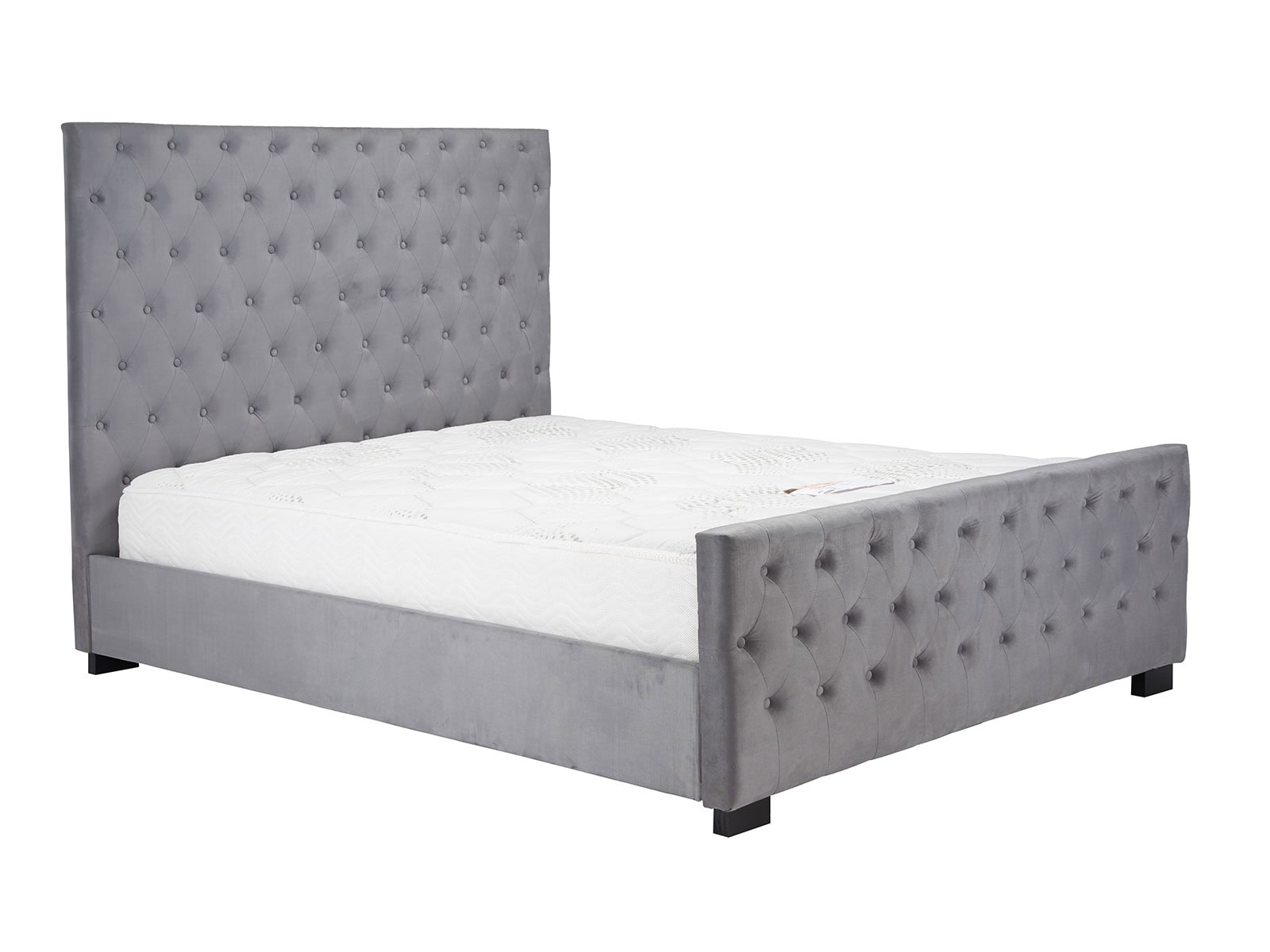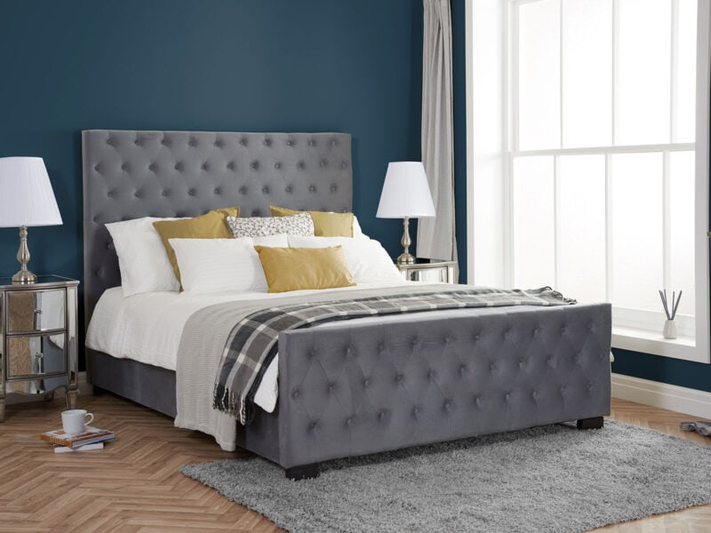 The Marquis bed is upholstered in a luxurious grey velvet and features a beautiful tufted detailing headboard.