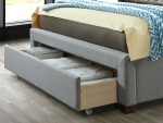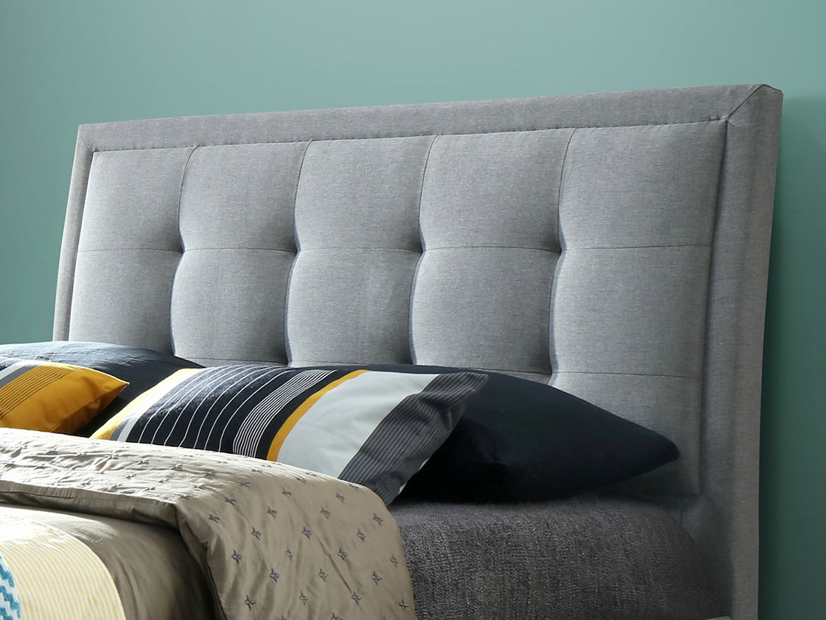 Upholstered in a beautiful soft grey fabric, this low-based bed features a detailed deep-buttoned headboard.