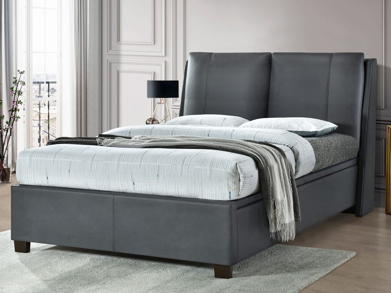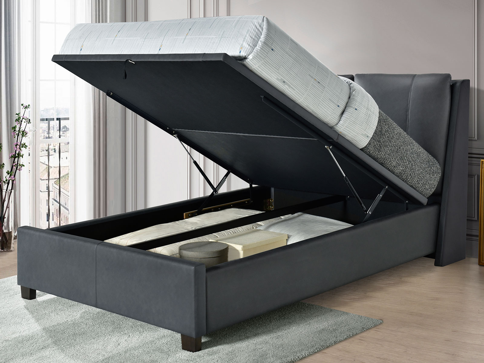 The Ashleigh 4ft 6in Pillowback Ottoman Bed in PU Grey offers functionality and luxury with its stylish PU upholstery and convenient ottoman storage. This double bed combines comfort and practicality for a clutter-free bedroom experience.
