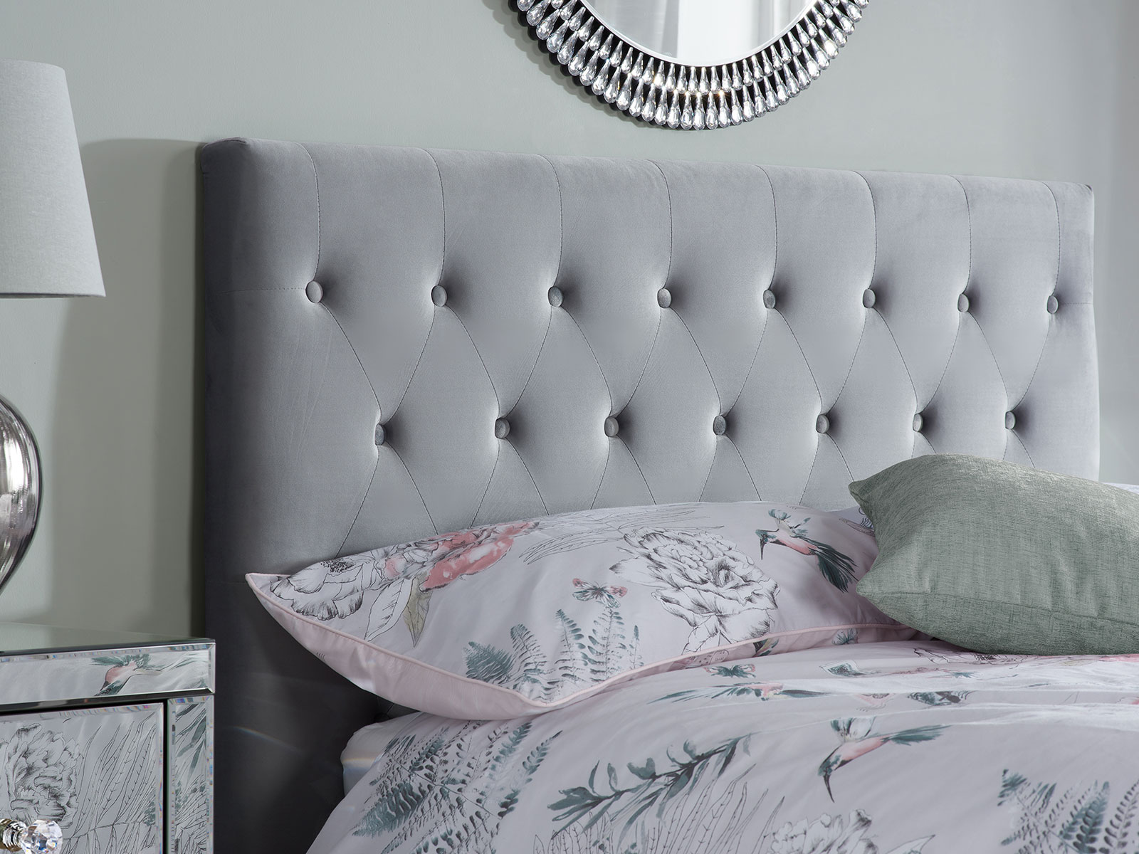 ? The Cologne Bedstead Is Upholstered In Either A Steel Crushed Velvet Or A Grey Fabric And Features A Striking Buttoned Headboard.