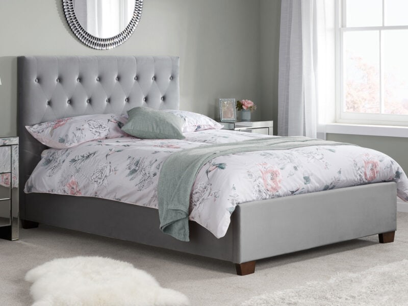 The Cologne bedstead is upholstered in either a steel crushed velvet or a grey fabric and features a striking buttoned headboard.