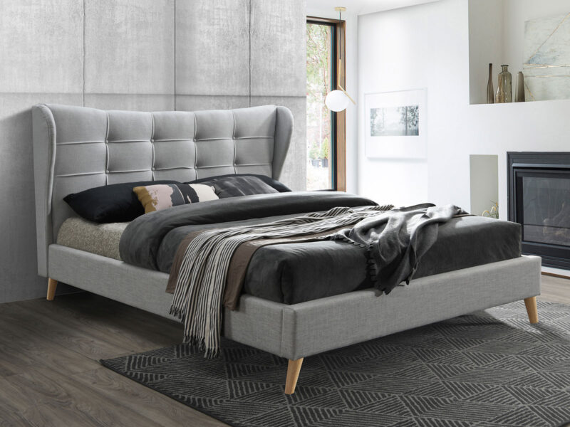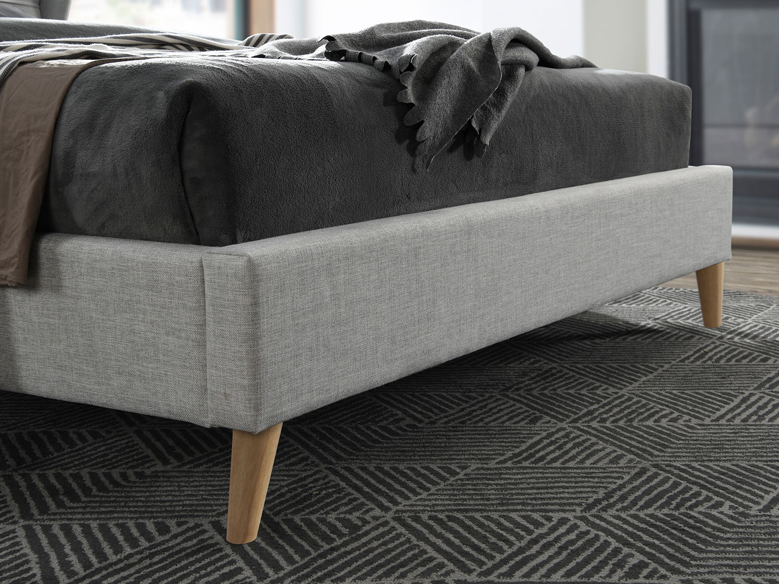 The Harper bedstead is upholstered in a lovely dove grey fabric and features a striking buttoned headboard.