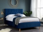 The Loxley bed frame is upholstered in polyester with complementary light feet and is available in mustard, grey, green and blue.