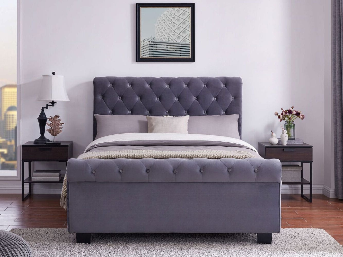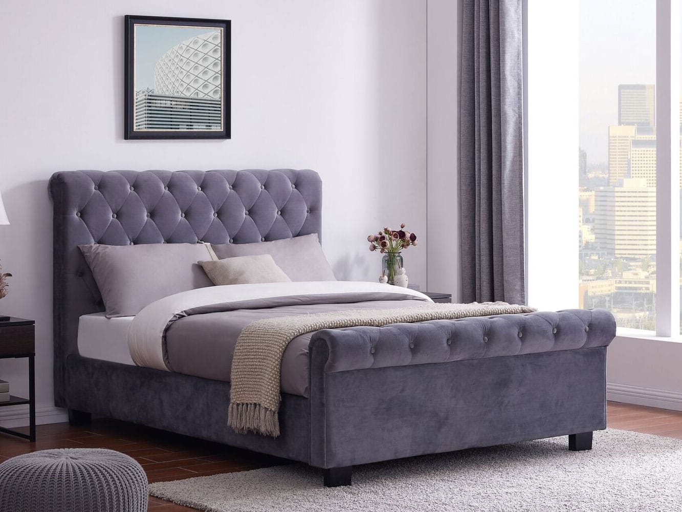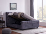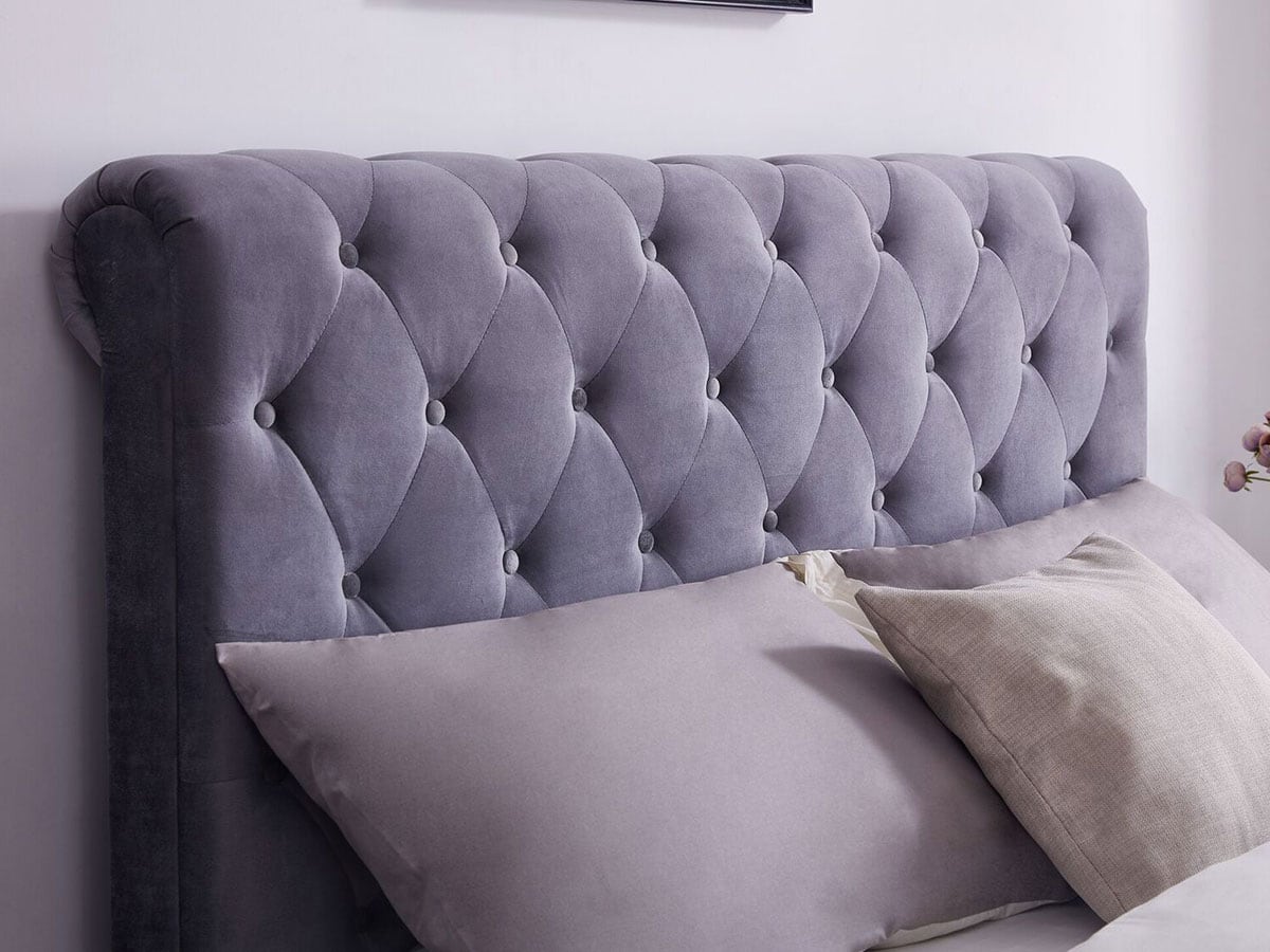 The Flintshire Furniture Whitford Fabric Side Ottoman Bed features a Chesterfield style, gently scrolled tall headboard and matching low footboard and upholstered in a sumptuous grey crushed velvet soft fabric.