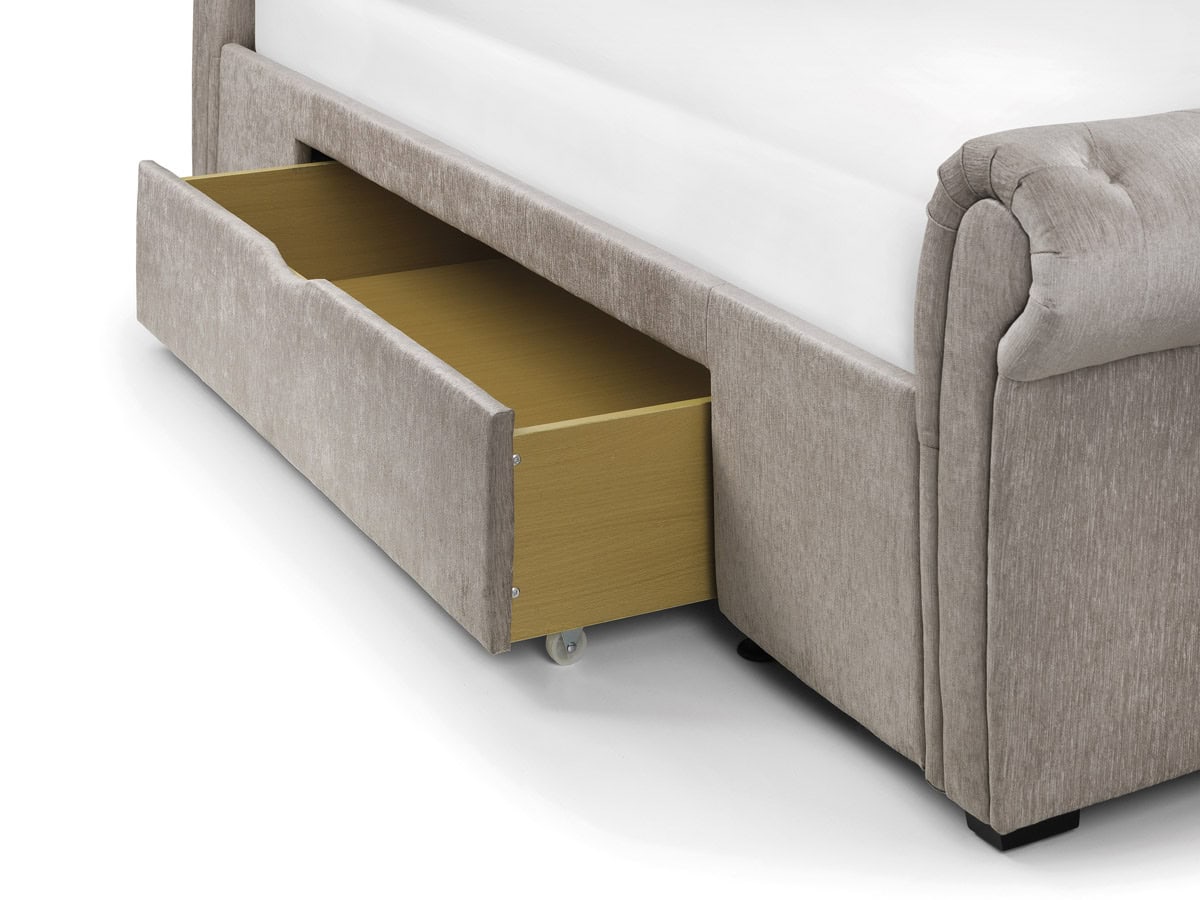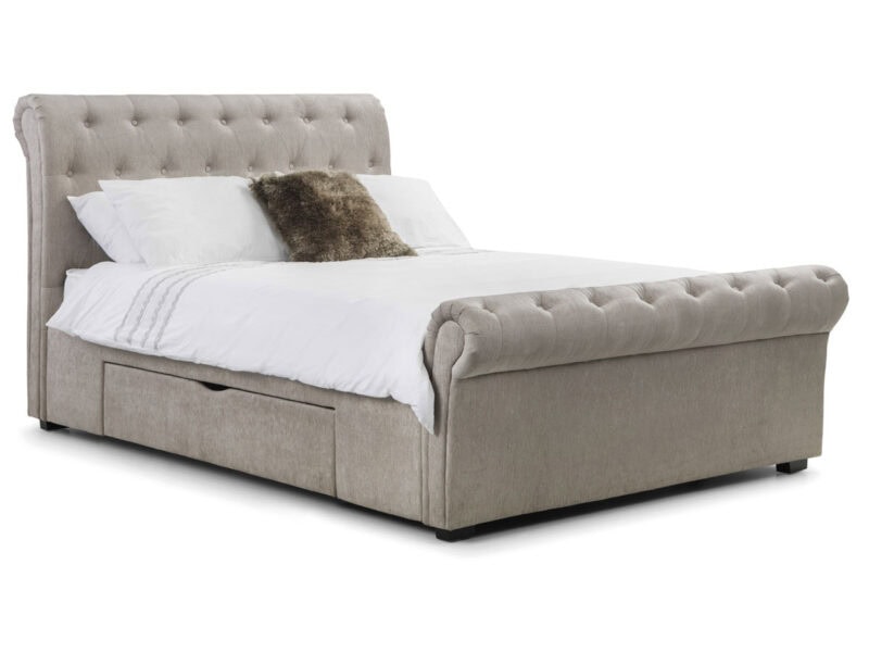 -43%A classic and majestic deep buttoned, scroll feature bed upholstered in a soft touch mink chenille fabric. Sprung slatted base for extra comfort and prolonged mattress life.