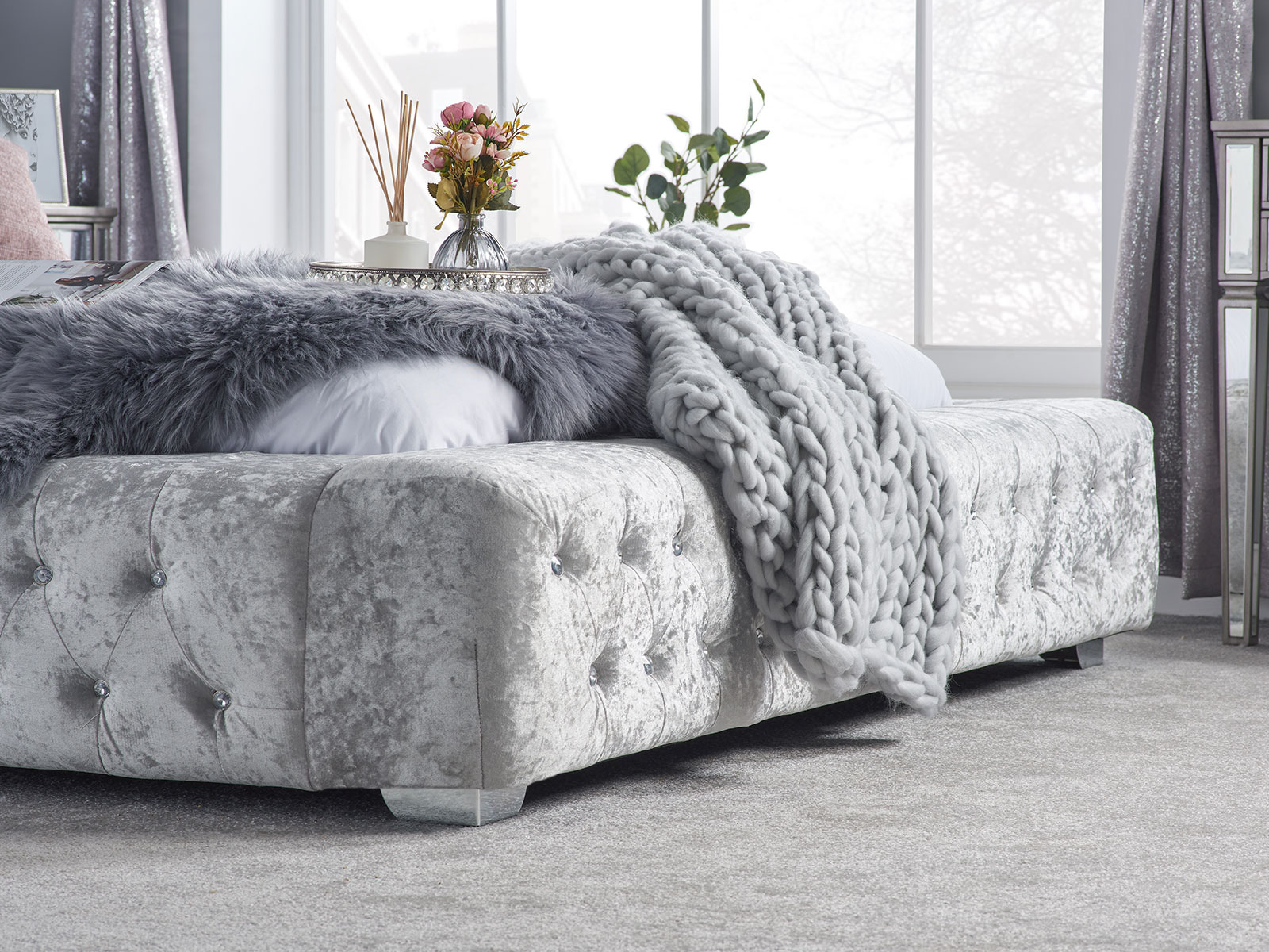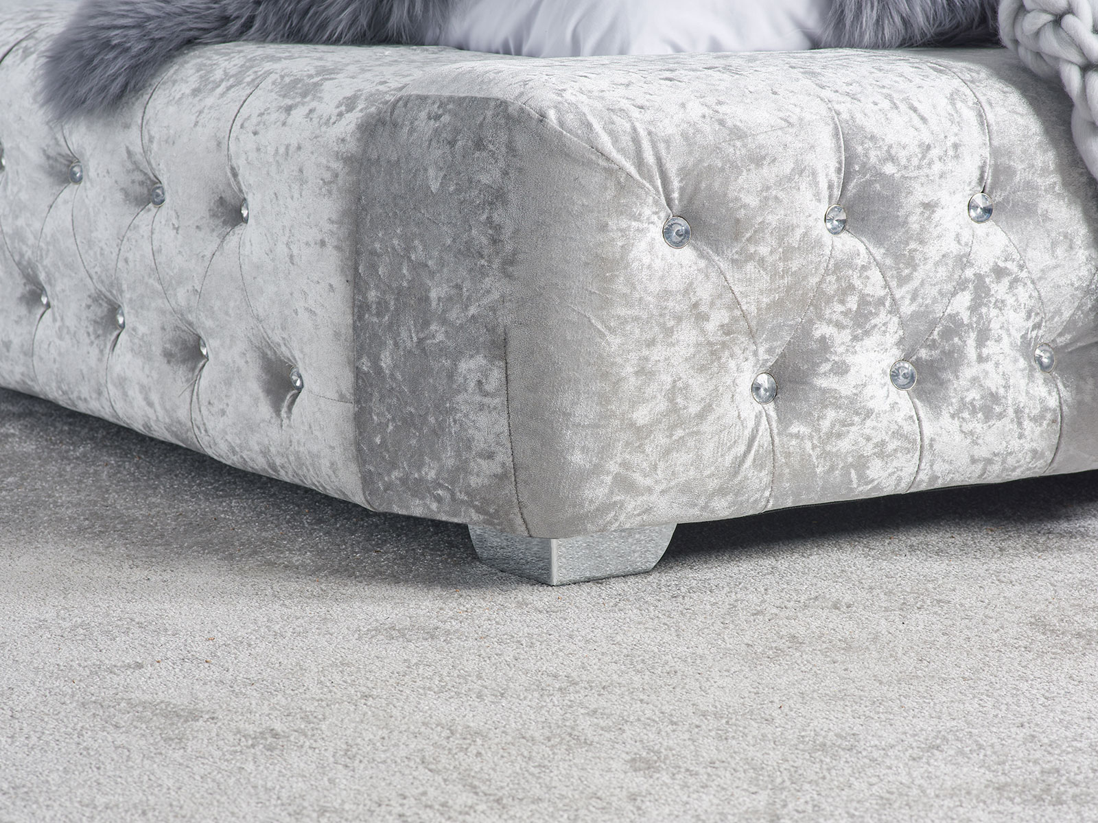 The Grande bed frame is upholstered in polyester with silver feet and comes in a beautiful crushed steel velvet.
