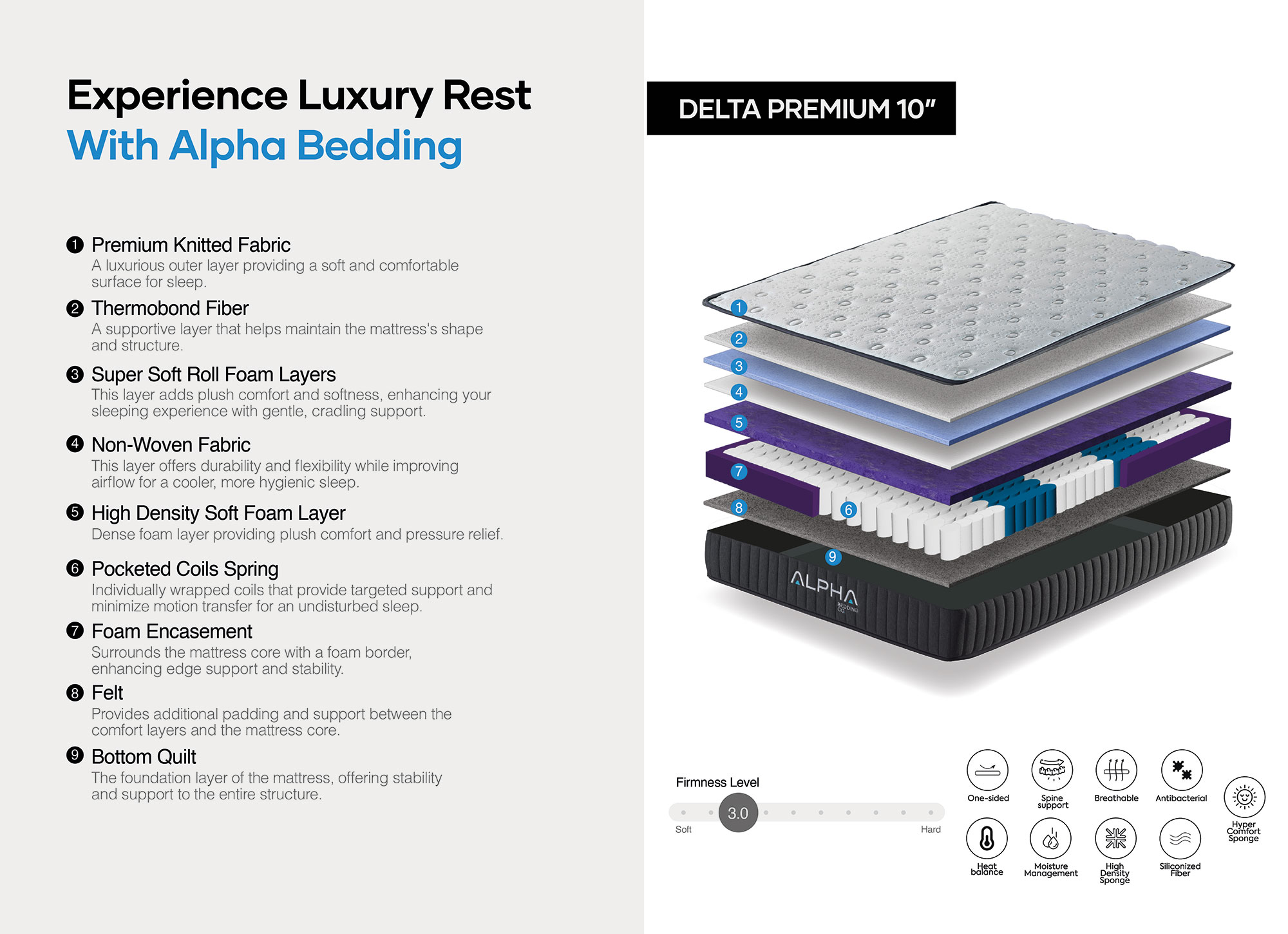 Experience luxury rest with the Alpha Beds Delta Premium 10″ Mattress, expertly engineered to deliver exceptional comfort, support, and durability. Combining advanced foam technology with a responsive pocket spring system, this mattress is designed to promote deeper, more restorative sleep night after night.