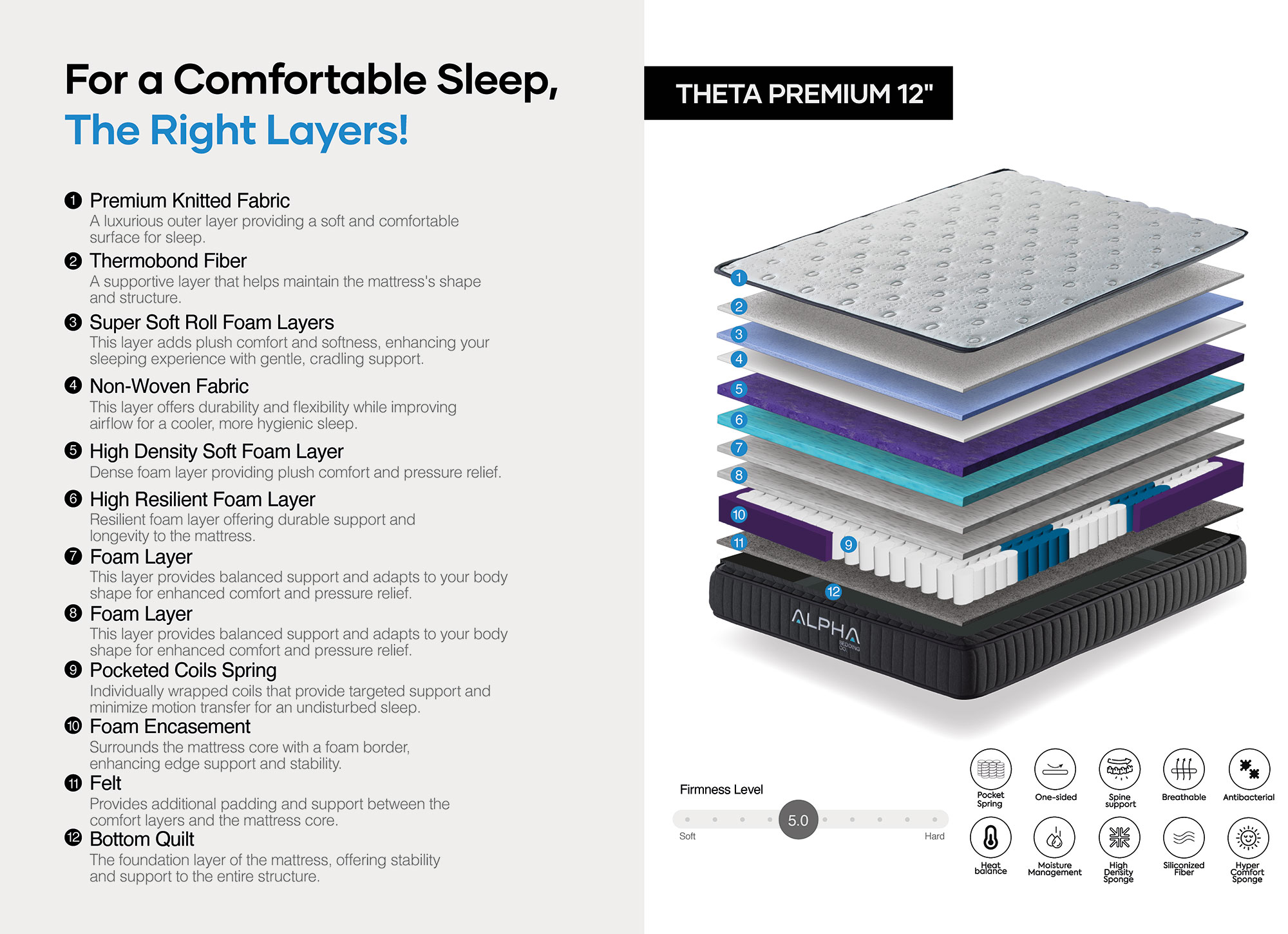 The Theta Premium Mattress features a meticulously engineered multi-layer structure to ensure comfort, durability, and consistent support: