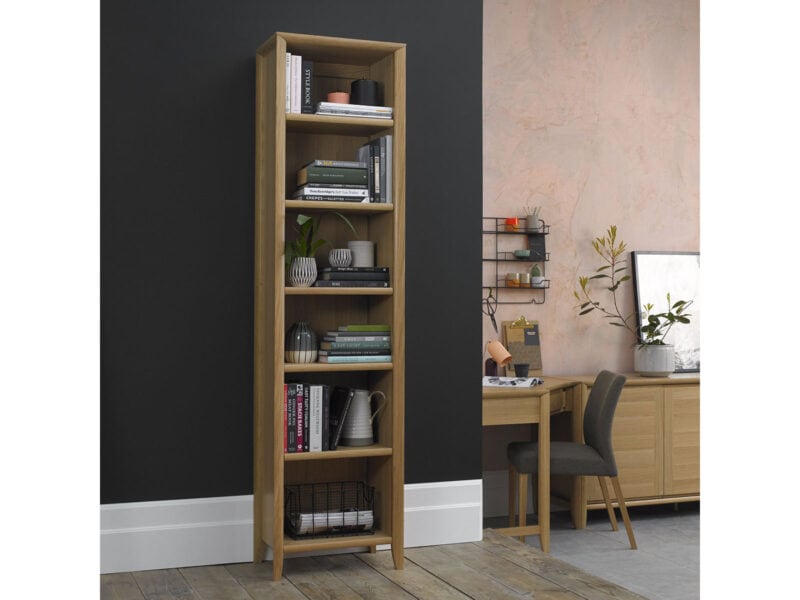 Bergen is a strikingly contemporary, modular-based collection of dining, living room & home office furniture that offers flexibility and practicality in tune with today’s lifestyles. Made with a combination of attractive grey washed oak tops contrasting with soft grey pigment frames, this range is hugely versatile, offering three sizes of tables, ultramodern low back slat and upholstered chairs as well as a more standard high back slat chair, in fabric or faux leather options. The design features curved tapering legs that meet the patterned tops in a three way mitre joint, boasting a real technical prowess by way of precise CNC machining, neat finishes and general technical excellence to create a complex simplicity! Inspired by the needs of open plan living, it allows you to create functional combinations of shelf units and cabinet pieces that fIt’seamlessly within dining, lounge or home office settings. The Bergen collection is the perfect solution for the demands of modern-day living.