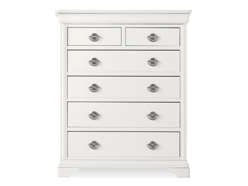 The Chantilly White bedroom collection is crafted from white painted American poplar solids and veneers and offers a contemporary update to classic French styling. Chantilly effortlessly combines a bold character with subtle attention to detail that results in a range that is, quite simply, beautiful. Intricate details such as a curved crest rail on the bed and bespoke shield handles contribute to the beauty of this range, while surprising features such as hidden drawers and soft-closing runners allow for a superior user experience. Chantilly is an exquisitely grand range that will add an opulent touch to any bedroom