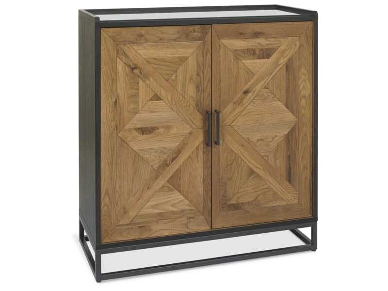 Indus is a striking design combining saw cut oak marquetry tops with a ‘peppercorn’ finished wire brushed oak veneered frame and a welded black powder coated metal base, giving it an on trend industrial edge. Each of the hand-crafted pattern tops are wire brushed and distressed to give a rustic look and tactile feel, making the most of the beautiful and varied grain of oak. Choose from generously proportioned oak upholstered chairs in four velvet options or a mottled grey fabric or cantilever chairs that feature this same fabric in a bold square pattern stitch detail with a handle in the back and superior glides on the base for ease of manoeuvre. BLUM soft closing hidden drawers within the sideboard cabinets add that extra refinement to the range in what will create a stunning focal point in any dining room.