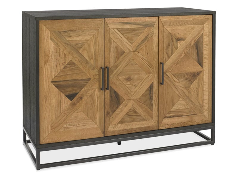 Indus is a striking design combining saw cut oak marquetry tops with a ‘peppercorn’ finished wire brushed oak veneered frame and a welded black powder coated metal base, giving it an on trend industrial edge. Each of the hand-crafted pattern tops are wire brushed and distressed to give a rustic look and tactile feel, making the most of the beautiful and varied grain of oak. Choose from generously proportioned oak upholstered chairs in four velvet options or a mottled grey fabric or cantilever chairs that feature this same fabric in a bold square pattern stitch detail with a handle in the back and superior glides on the base for ease of manoeuvre. BLUM soft closing hidden drawers within the sideboard cabinets add that extra refinement to the range in what will create a stunning focal point in any dining room.