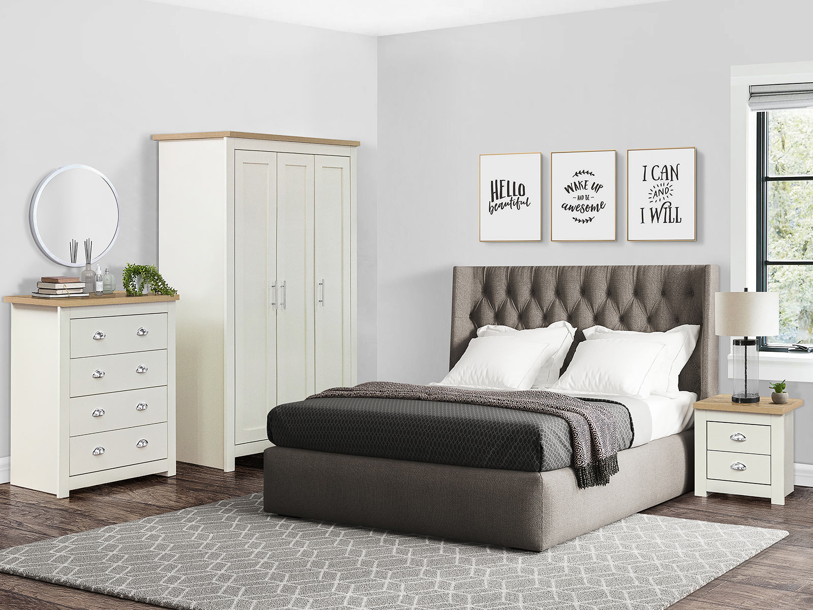• Available in cream & oak, grey & oak and navy & oak