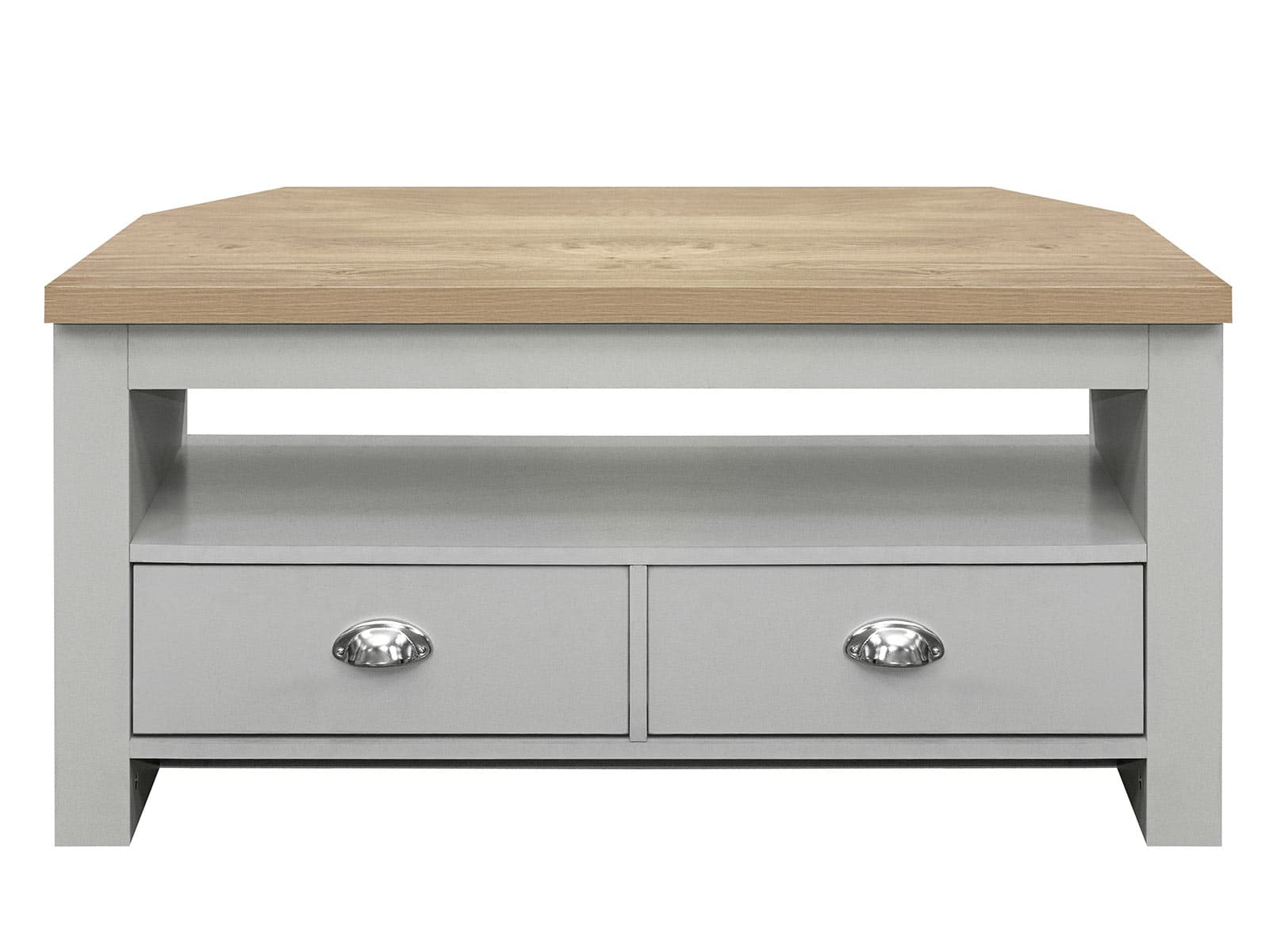 A beautiful addition to any room in your home, this Highgate Corner TV Unit is the perfect TV stand. Featuring a large shelf for entertainment units as well as 2 large storage drawers which are finished off with silver handles.