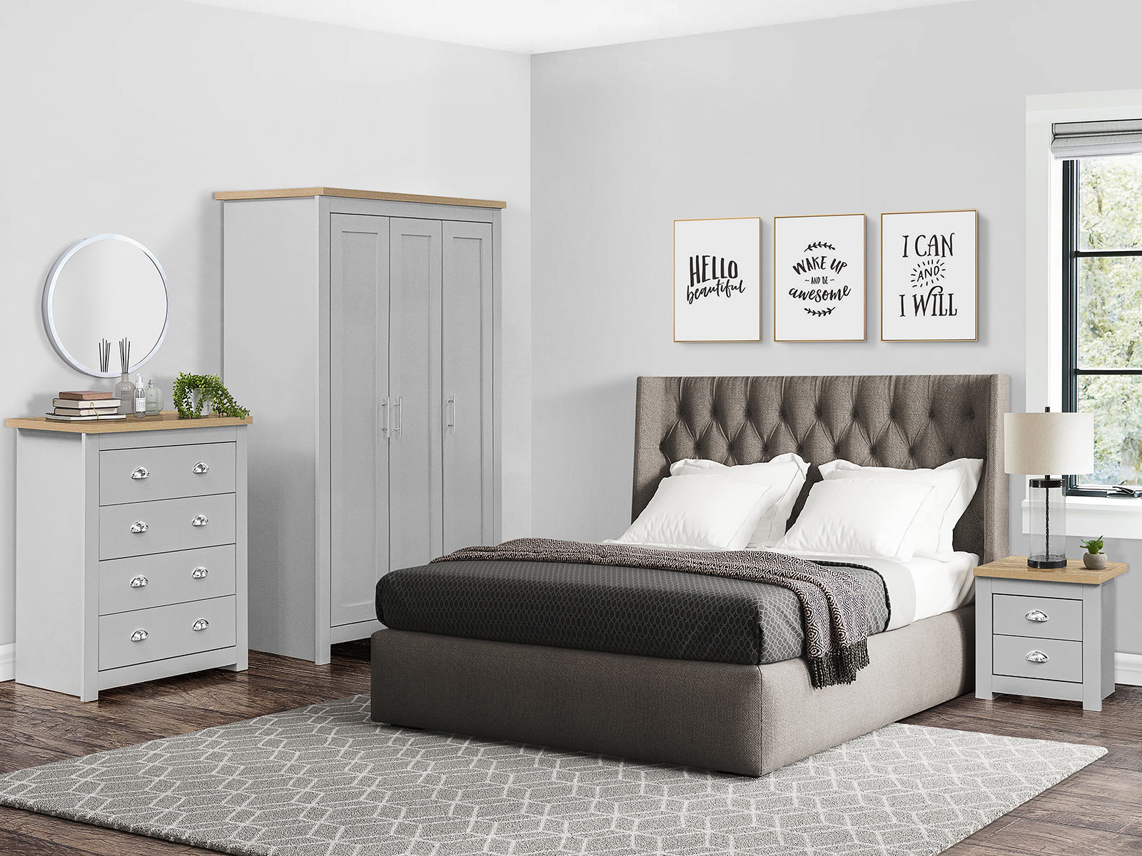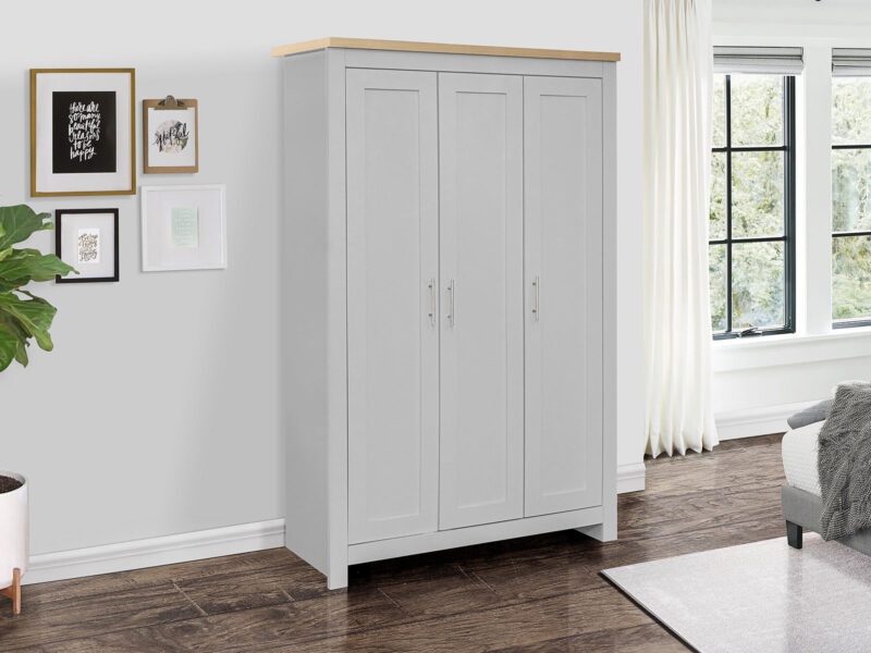The Highgate 3 door wardrobe is spacious behind double doors, featuring a hanging rail. The doors are finished off with contemporary silver handles.