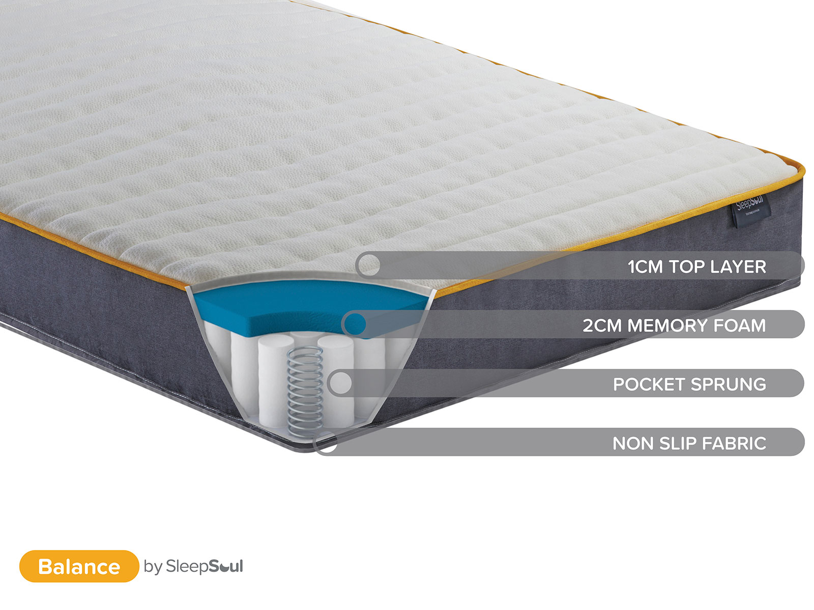 The SleepSoul Balance mattress provides complete support from head to toe thanks to it’s edge to edge 800 individual pocket springs and featuring an added layer of 2cm of memory foam that responds to your temperature and spreads weight evenly.