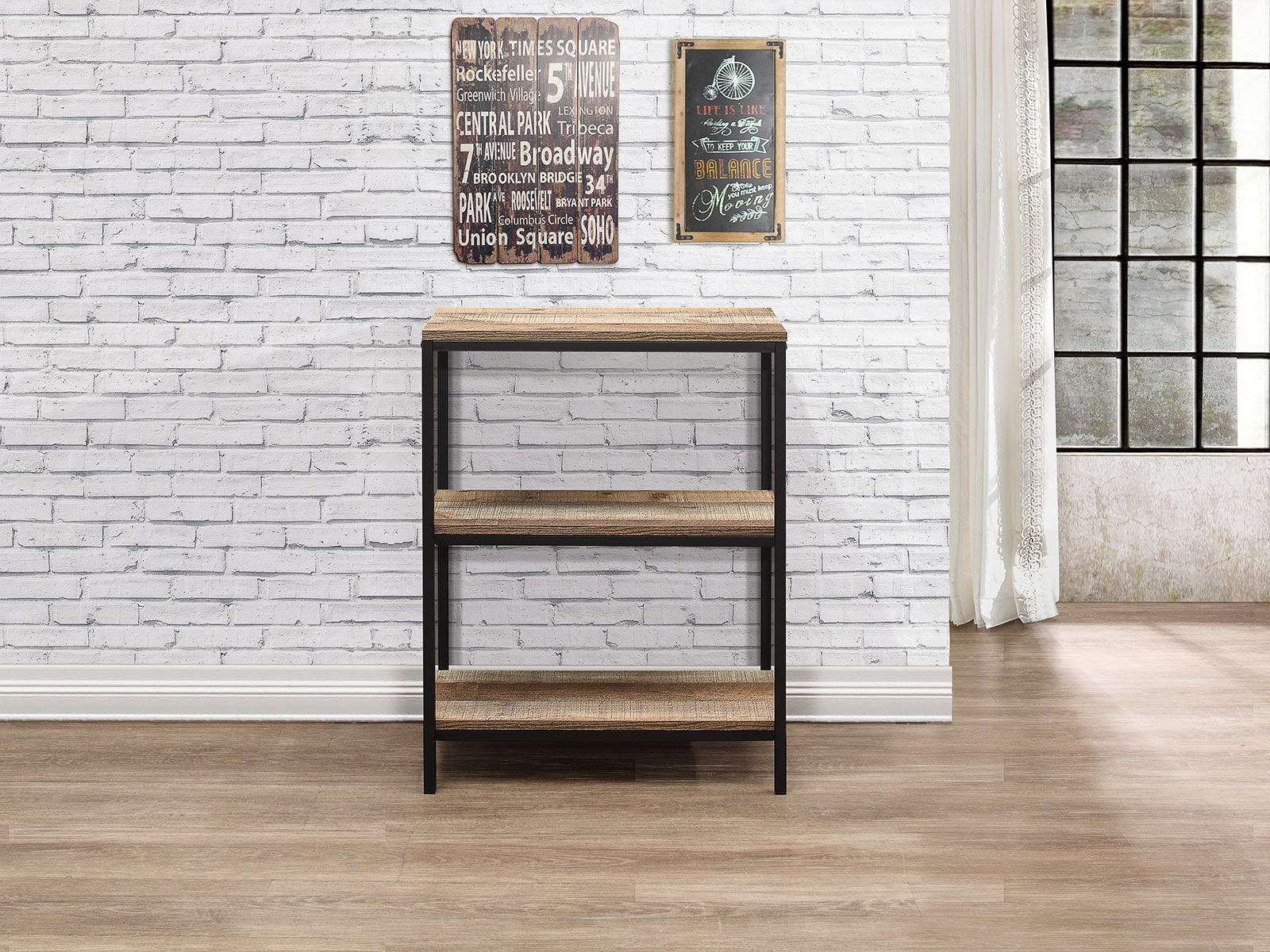 • Crafted from a metal frame with industrial-effect detail and has a wood-effect finish.