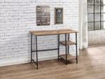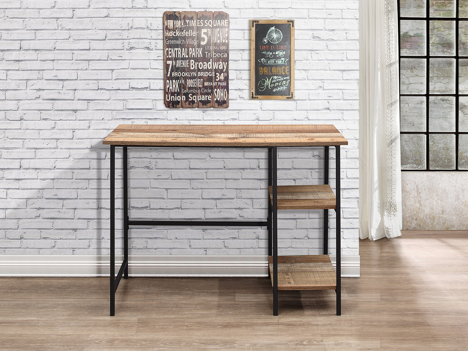Our Urban living room range radiates industrial chic. The Urban study desk provides ample work area for a home office and features 2 useful shelves for paperwork. Crafted from a metal frame with industrial-effect detail and features a wood-effect finish, the simple lines and subtle industrial style will give a contemporary twist to the focal point of any living room. Care instructions: Wipe carefully with a soft, dry cloth.