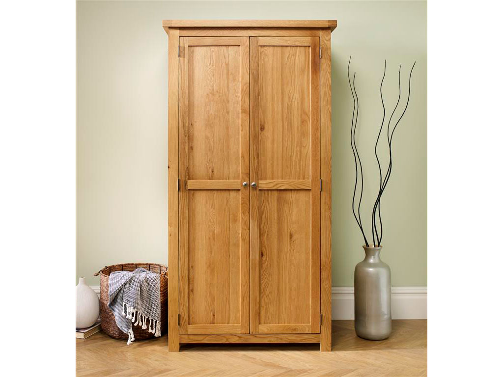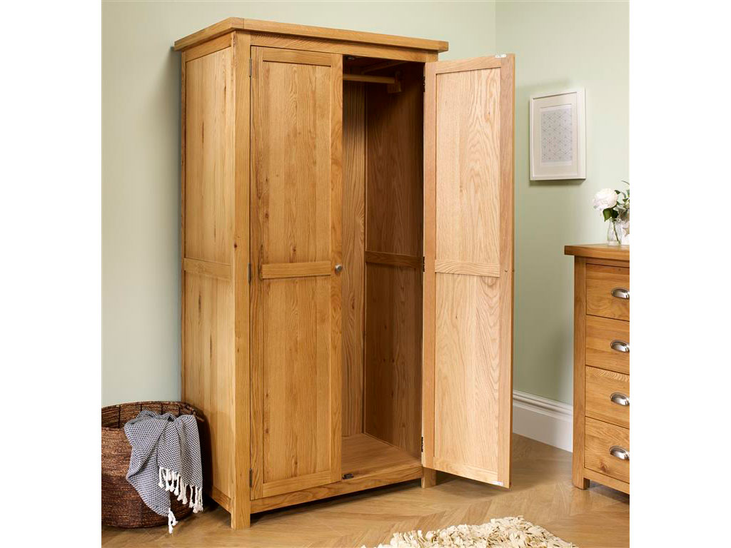 This 2-door wardrobe is spacious behind double doors, featuring a single rail, ideal for organising clothing.