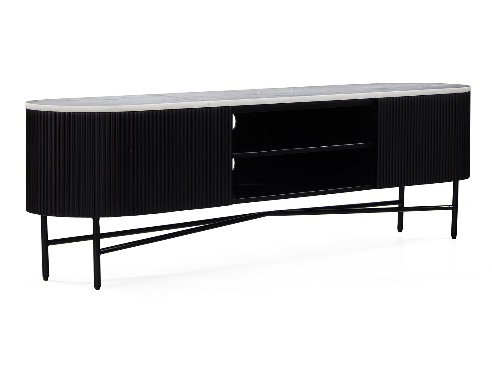 The Lucas range accentuates its racetrack curves with dynamic ribbing. Multiple finishes provide harmonious contrast, tinting the solid mango charcoal and leaving the marble top a natural hue. A black-finished base elevates the sideboard with round legs to complement the rounded silhouette. A push on the seamlessly integrated doors opens to inner storage to shelves.