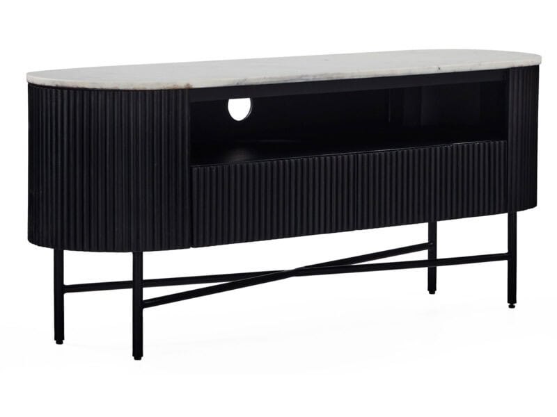 The Lucas range accentuates its racetrack curves with dynamic ribbing. Multiple finishes provide harmonious contrast, tinting the solid mango charcoal and leaving the marble top a natural hue. A black-finished base elevates the sideboard with round legs to complement the rounded silhouette. A push on the seamlessly integrated doors opens to inner storage to shelves.