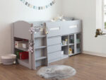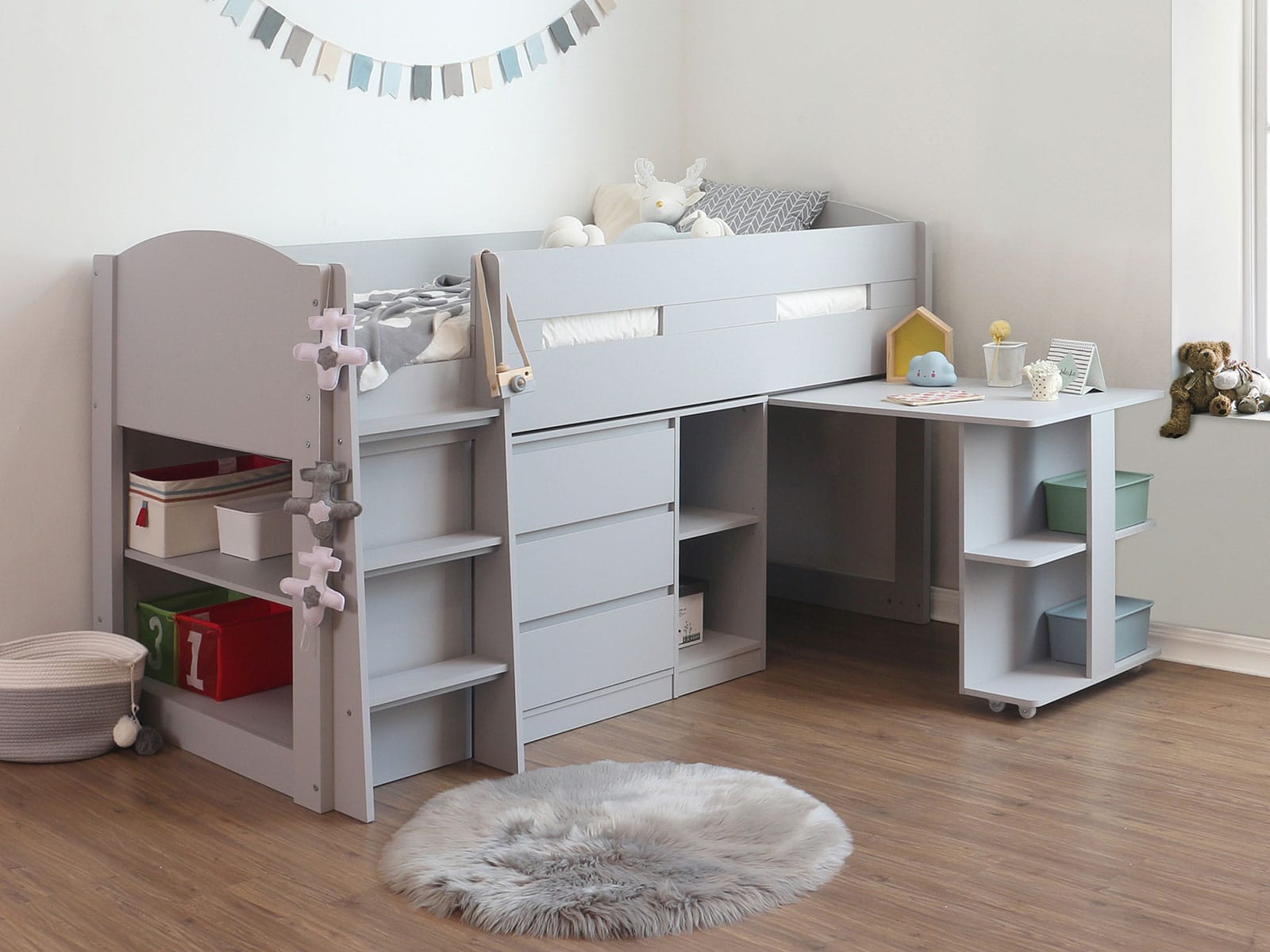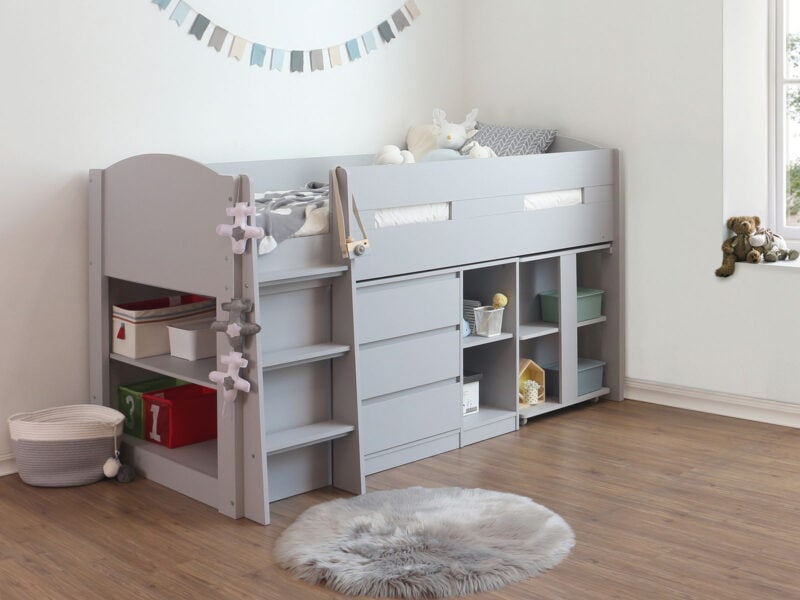 The Flintshire Furniture Billie Mid Sleeper cabin bed features a pull-out desk with storage shelves, a large three drawer chest and additional shelving, giving plenty of storage space.