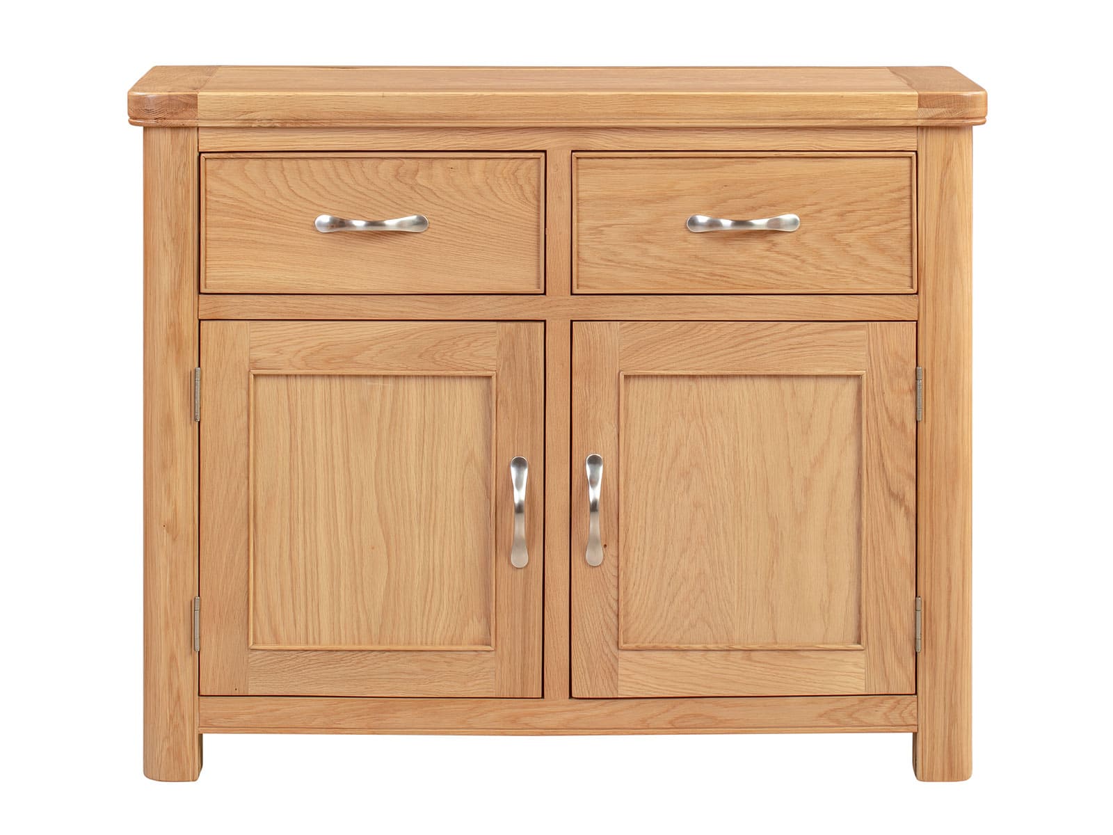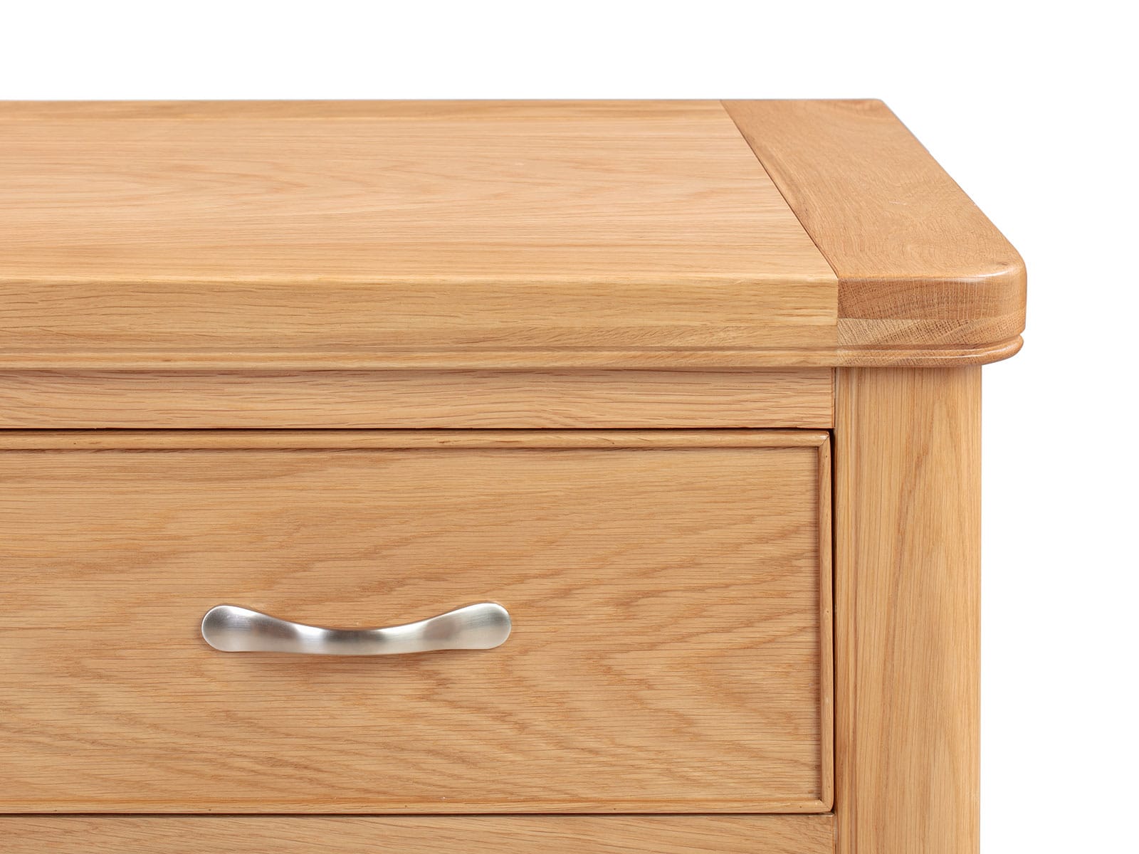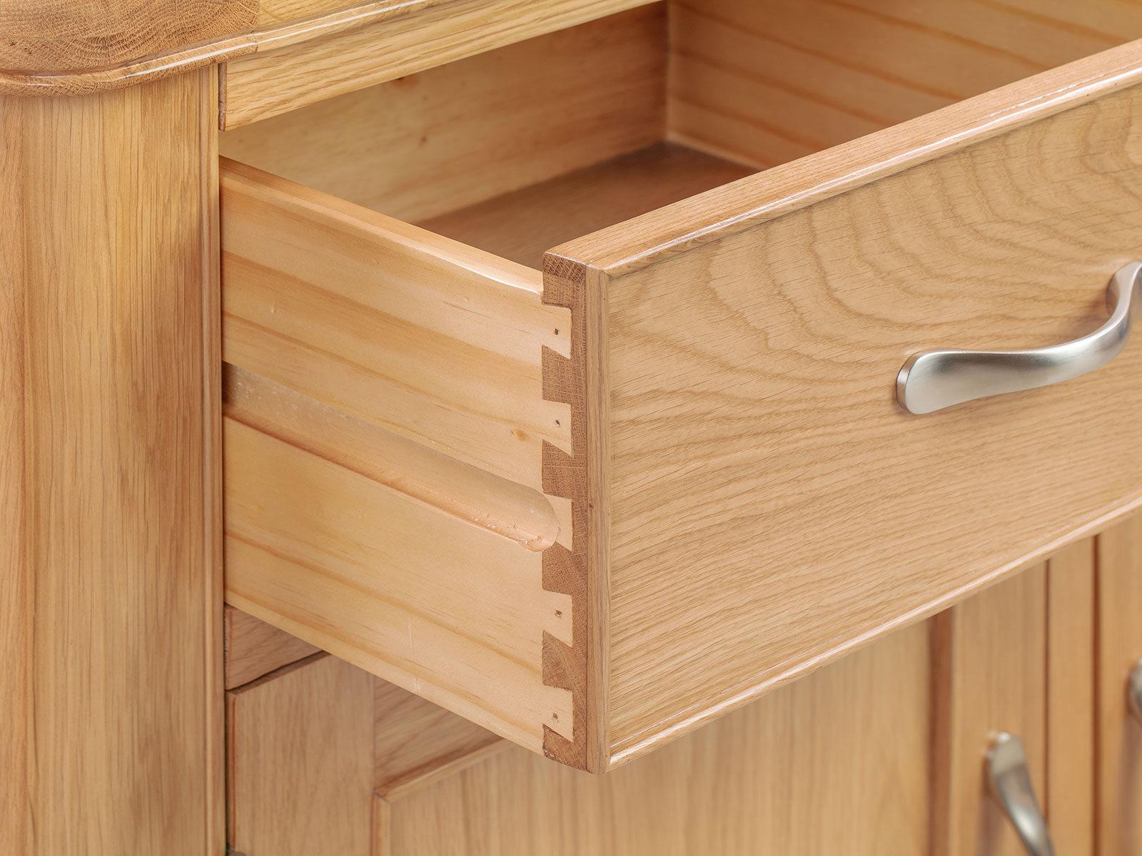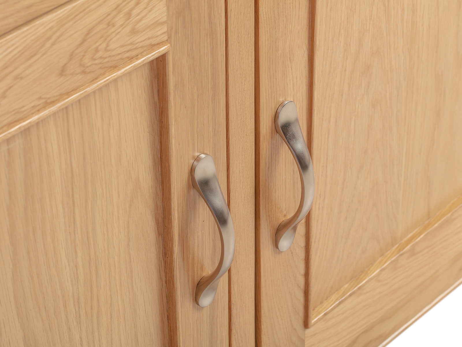 The Blenheim Oak Range of furniture is characterised by curved edges, classic moulding and a contemporary stainless steel handle. Blenheim Oak is finished in a natural colour with a clear lacquer.