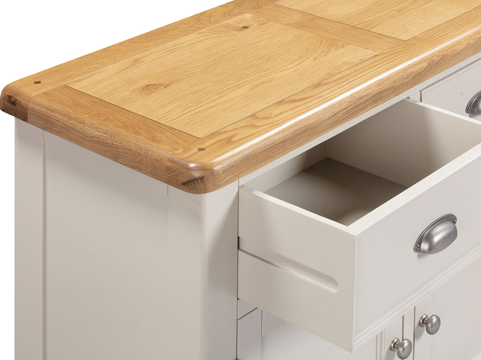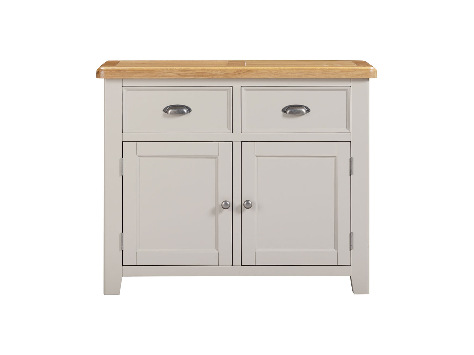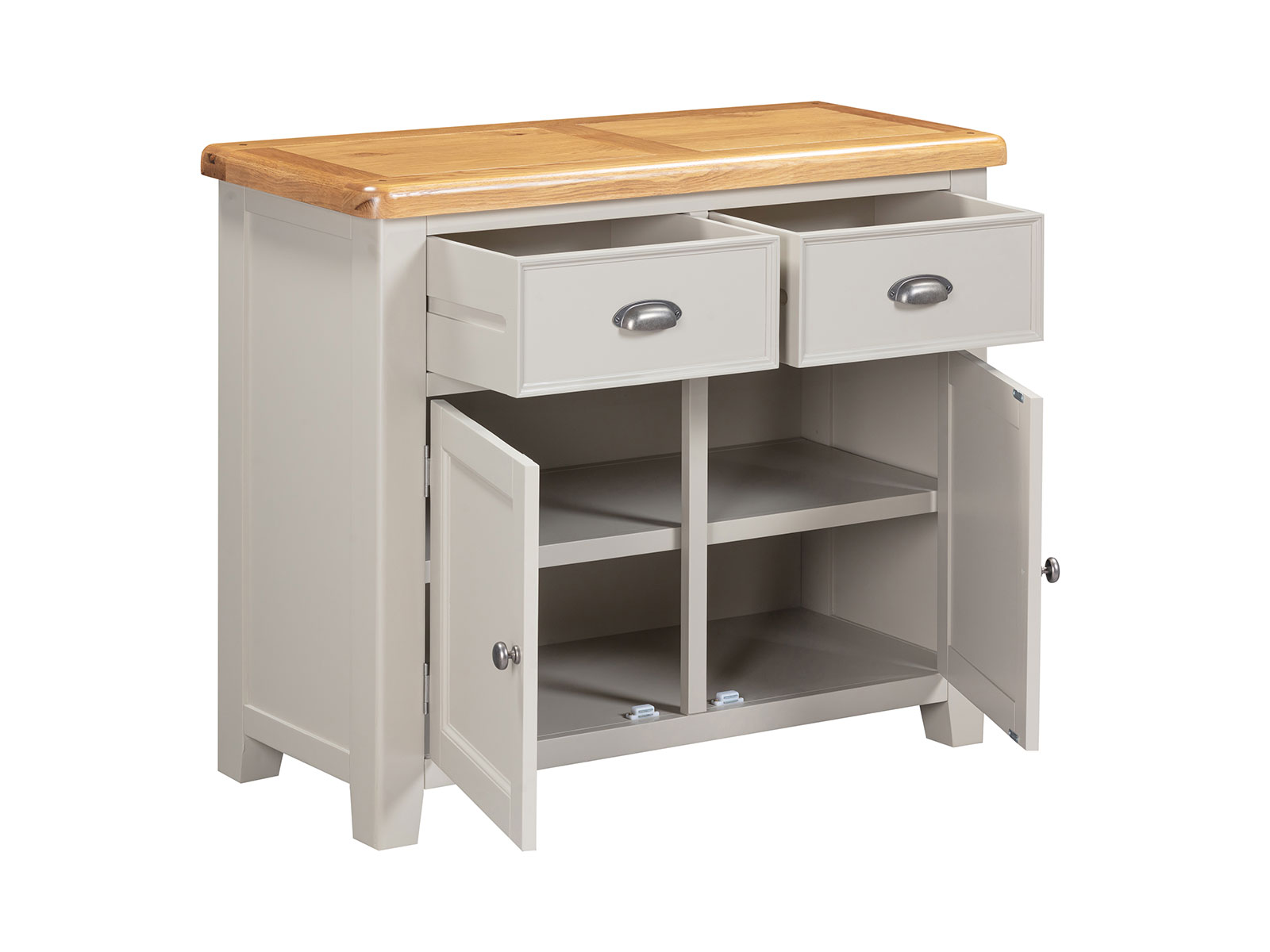 is manufactured with bases & legs in a light grey and finished with oak tops in a warm colour. Smooth, rounded corners, panelling and a retro cup handle give the range a traditional appeal for the modern home.