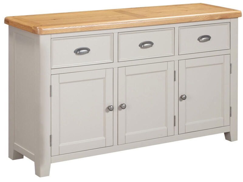 is manufactured with bases & legs in a light grey and finished with oak tops in a warm colour. Smooth, rounded corners, panelling and a retro cup handle give the range a traditional appeal for the modern home.