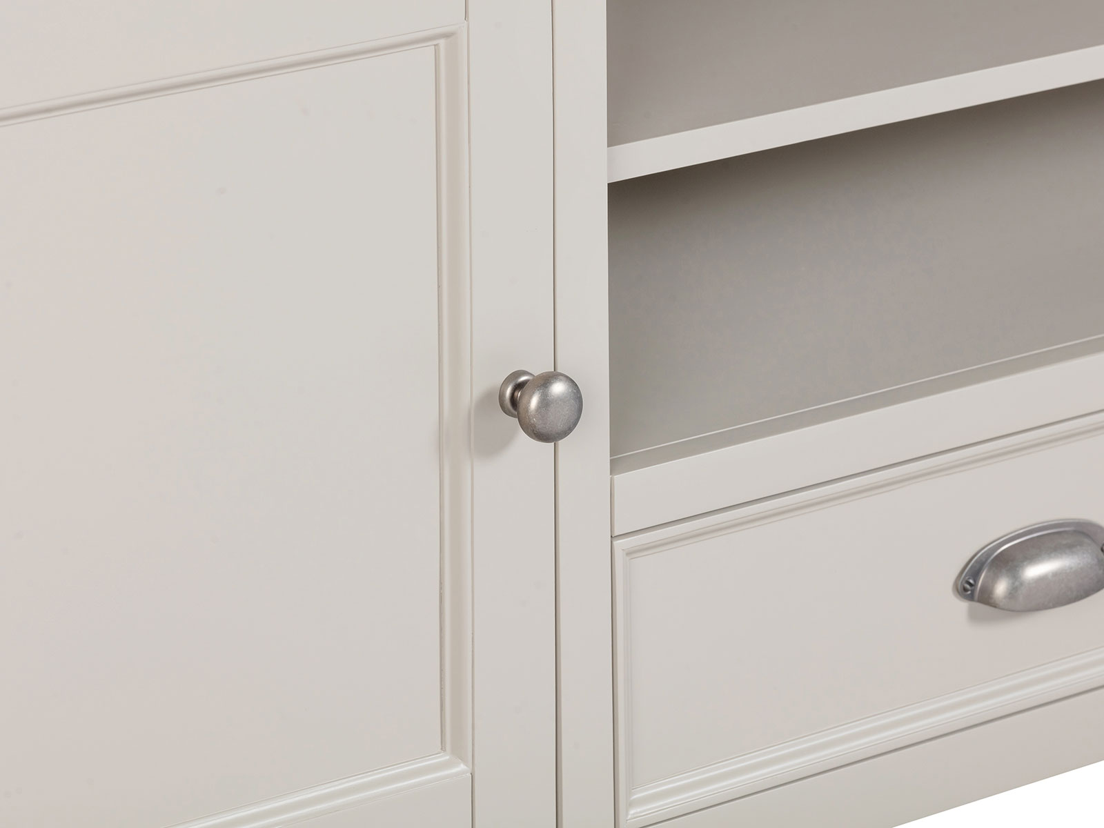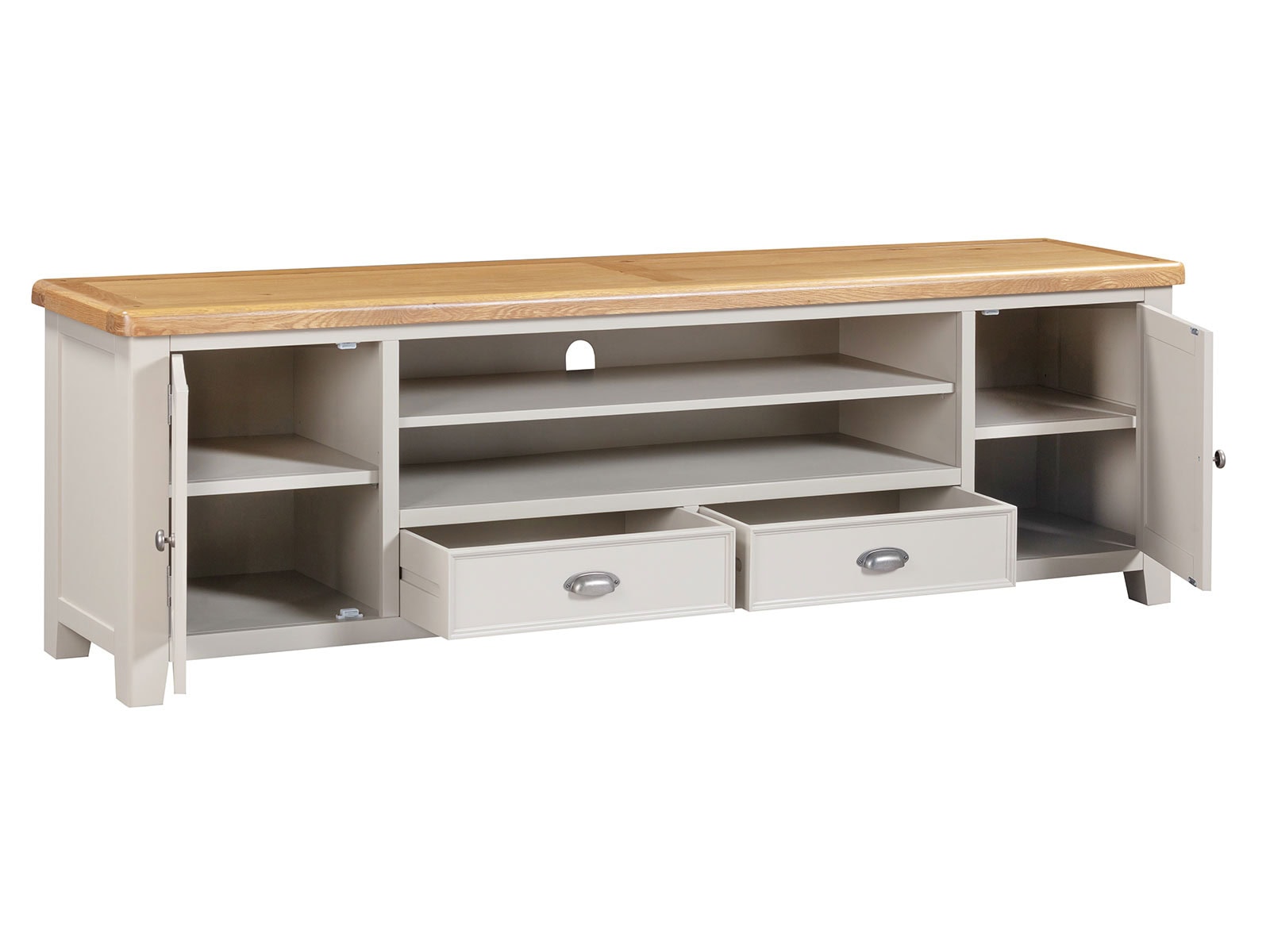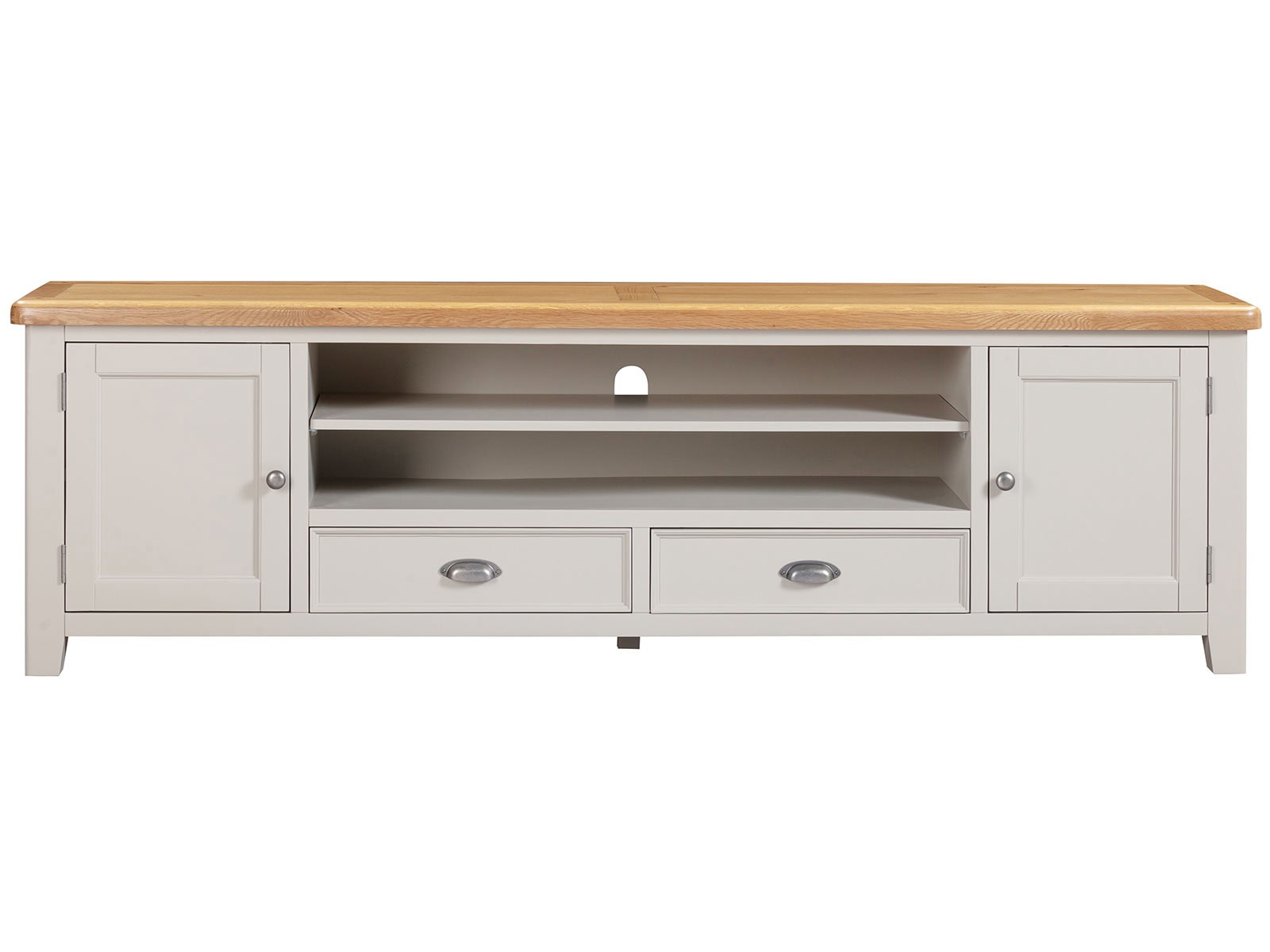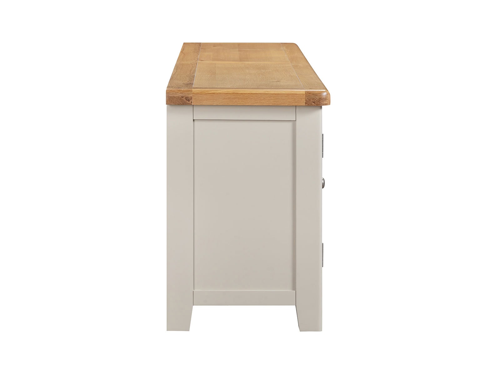 is manufactured with bases & legs in a light grey and finished with oak tops in a warm colour. Smooth, rounded corners, panelling and a retro cup handle give the range a traditional appeal for the modern home.