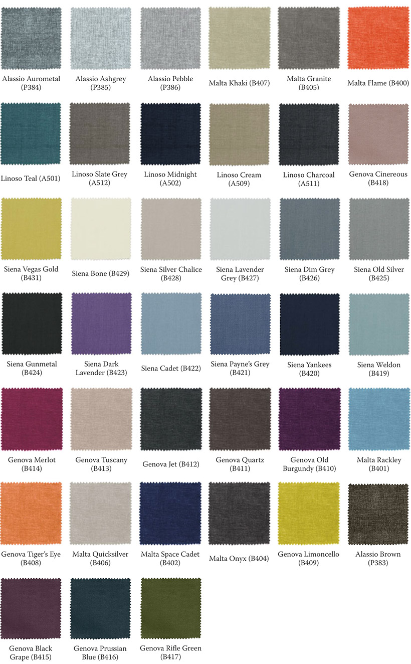 | Fabric Option | Alassio Aurometal (P384), Alassio Ashgrey (P385), Alassio Pebble (P386), Malta Khaki (B407), Malta Granite (B405), Malta Flame (B400), Linoso Teal (A501), Linoso Slate Grey (A512), Linoso Midnight (A502), Linoso Cream (A509), Linoso Charcoal (A511), Genova Cinereous (B418), Siena Vegas Gold (B431), Siena Bone (B429), Siena Silver Chalice (B428), Siena Lavender Grey (B427), Siena Dim Grey (B426), Siena Old Silver (B425), Siena Gunmetal (B424), Siena Dark Lavender (B423), Siena Cadet (B422), Siena Payne's Grey (B421), Siena Yankees (B420), Siena Weldon (B419), Genova Merlot (B414), Genova Tuscany (B413), Genova Jet (B412), Genova Quartz (B411), Genova Old Burgundy (B410), Malta Rackley (B401), Genova Tiger's Eye (B408), Malta Quicksilver (B406), Malta Space Cadet (B402), Malta Onyx (B404), Genova Limoncello (B409), Alassio Brown (P383), Genova Black Grape (B415), Genova Prussian Blue (B416), Genova Rifle Green (B417) |