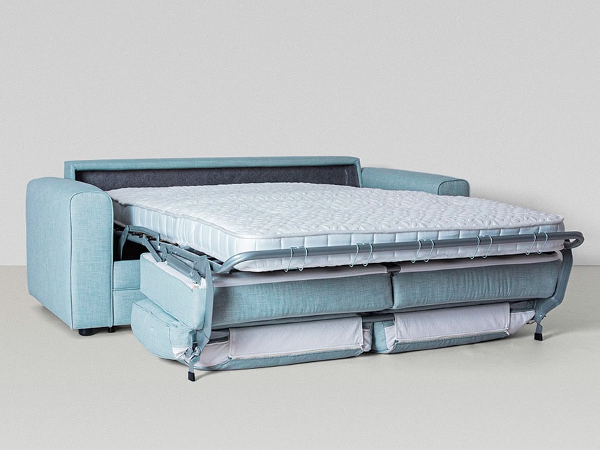 This sofa bed converts seamlessly from a sofa into a bed with a one fold mechanism that takes seconds. The built-in cushions neatly tuck themselves away under the mattress when it’s in sofa bed mode, so there is no need to remove them or store them elsewhere.