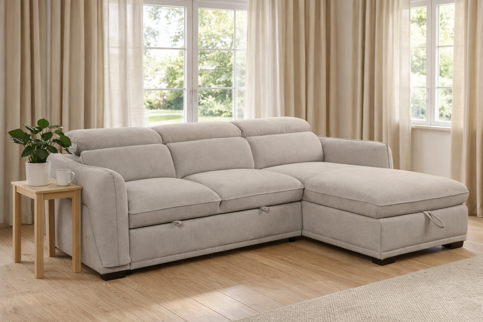 Upholstered in soft rye fabric fabric and available in two sophisticated neutral shades, Rye and Cocoa, the Alba sofa bed blends effortlessly with both contemporary and traditional interiors. The generously sized chaise also features hidden storage, providing a convenient place to store bedding, blankets or everyday items while keeping your living space neat and organised.