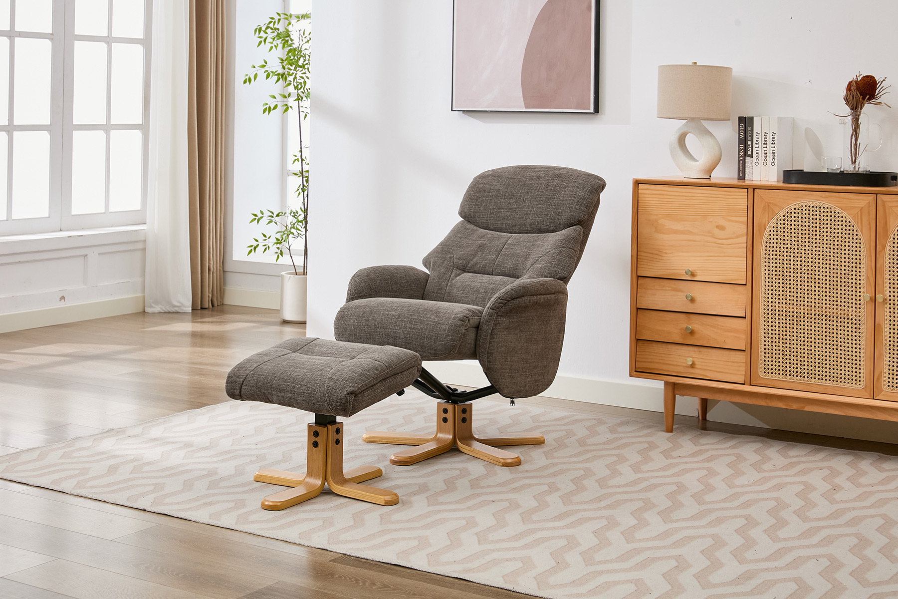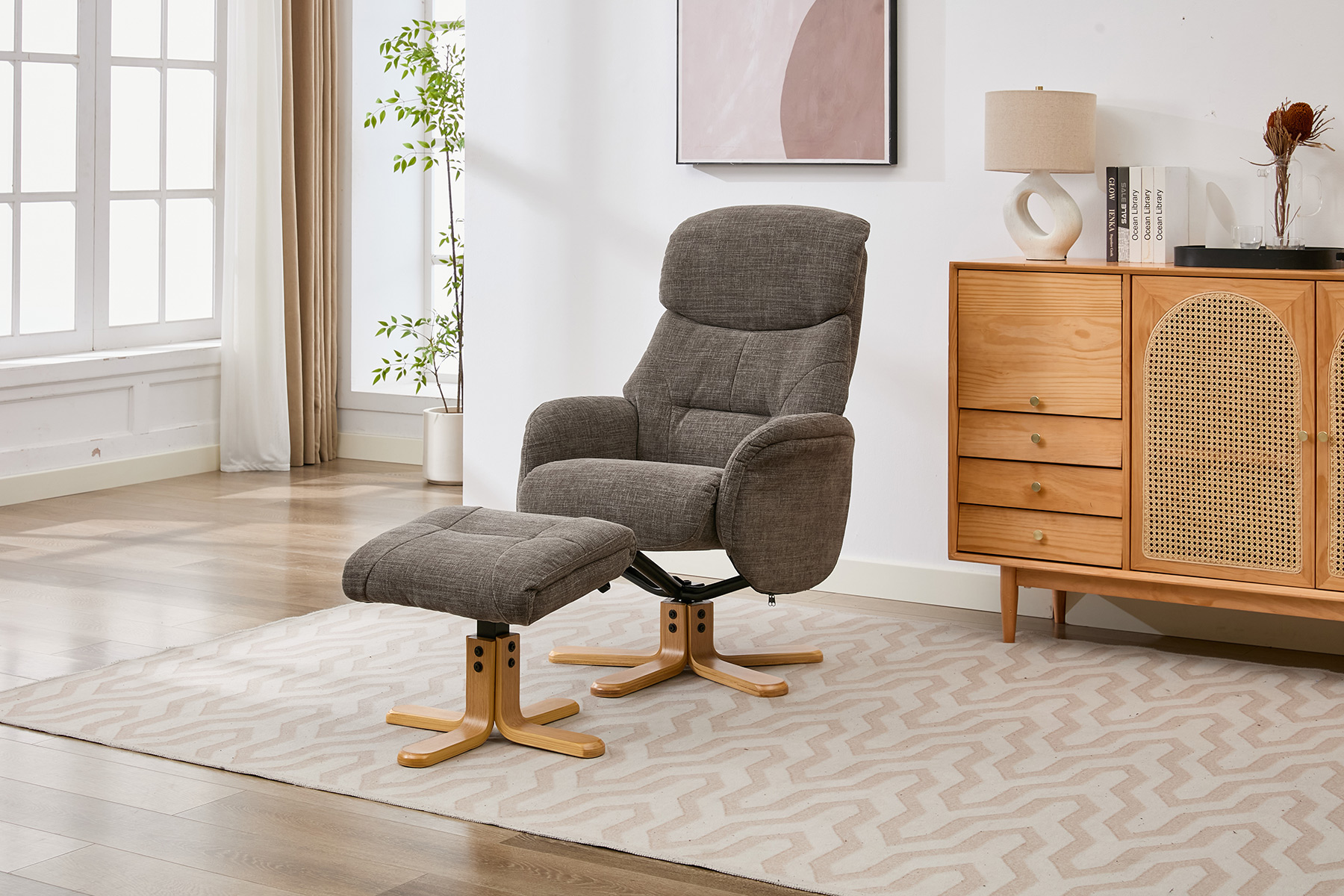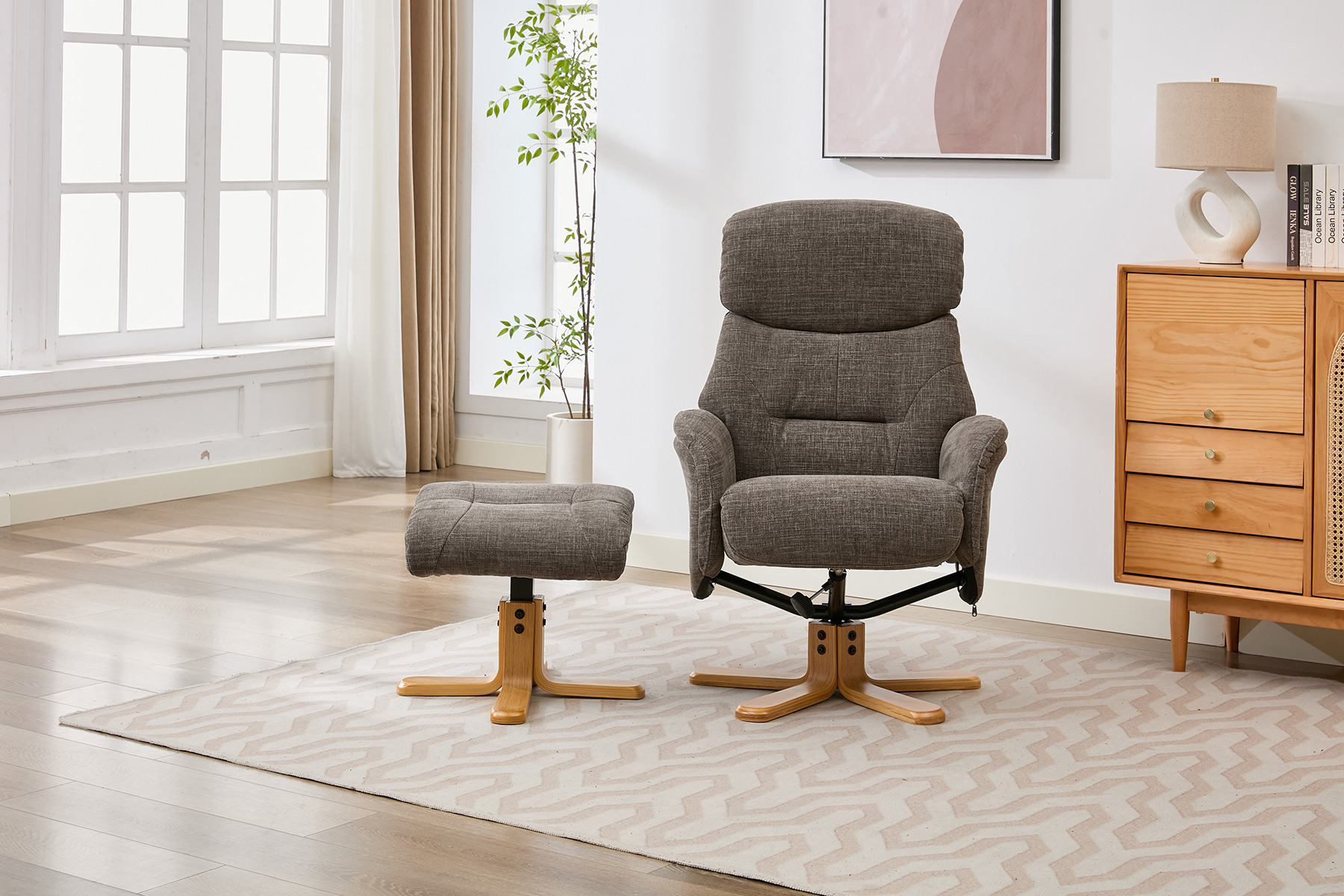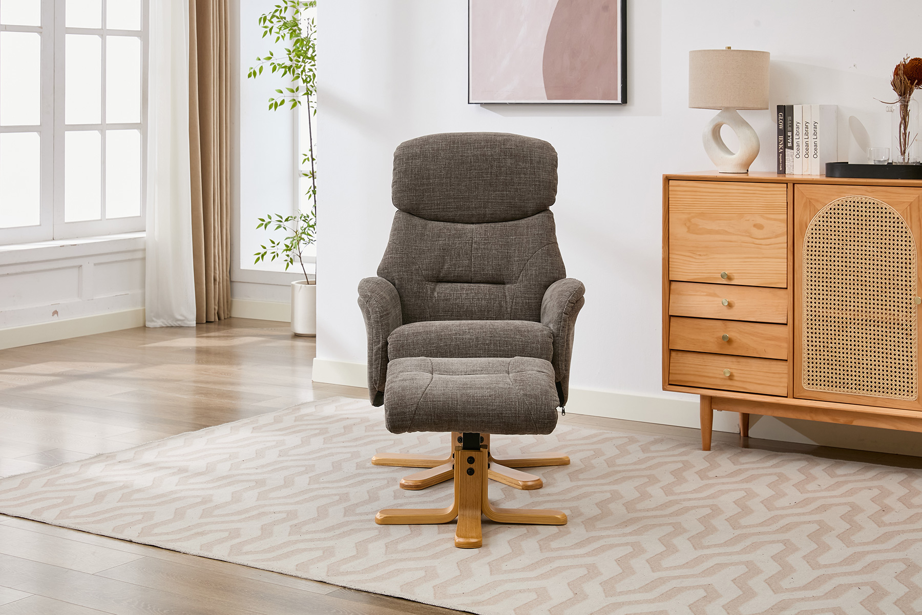 The Eden swivel recliner and footstool set from GFA Upholstery offers the perfect combination of comfort, style and contemporary design. Featuring attractive mid-oak legs that bring a natural warmth to your living space, this elegant recliner set is designed to complement modern interiors with ease.