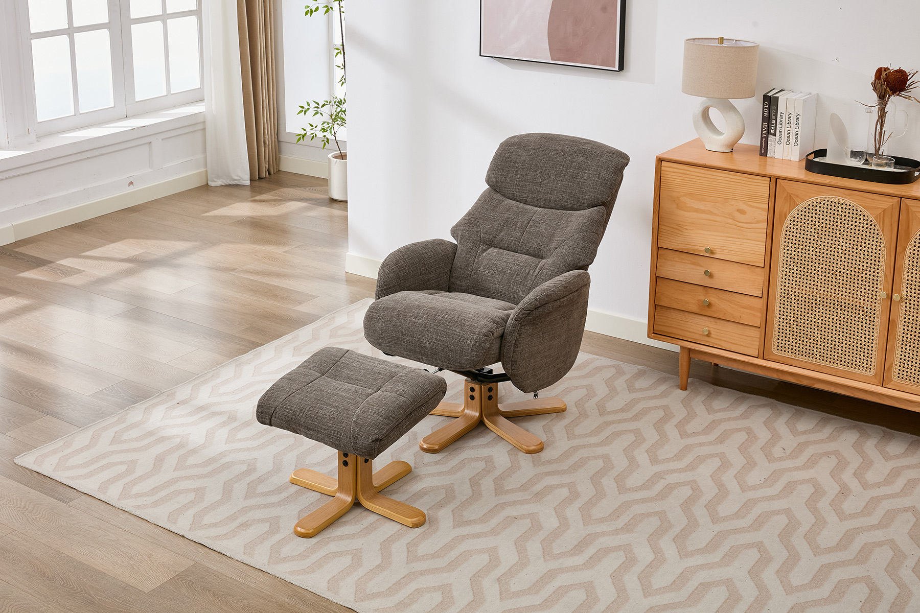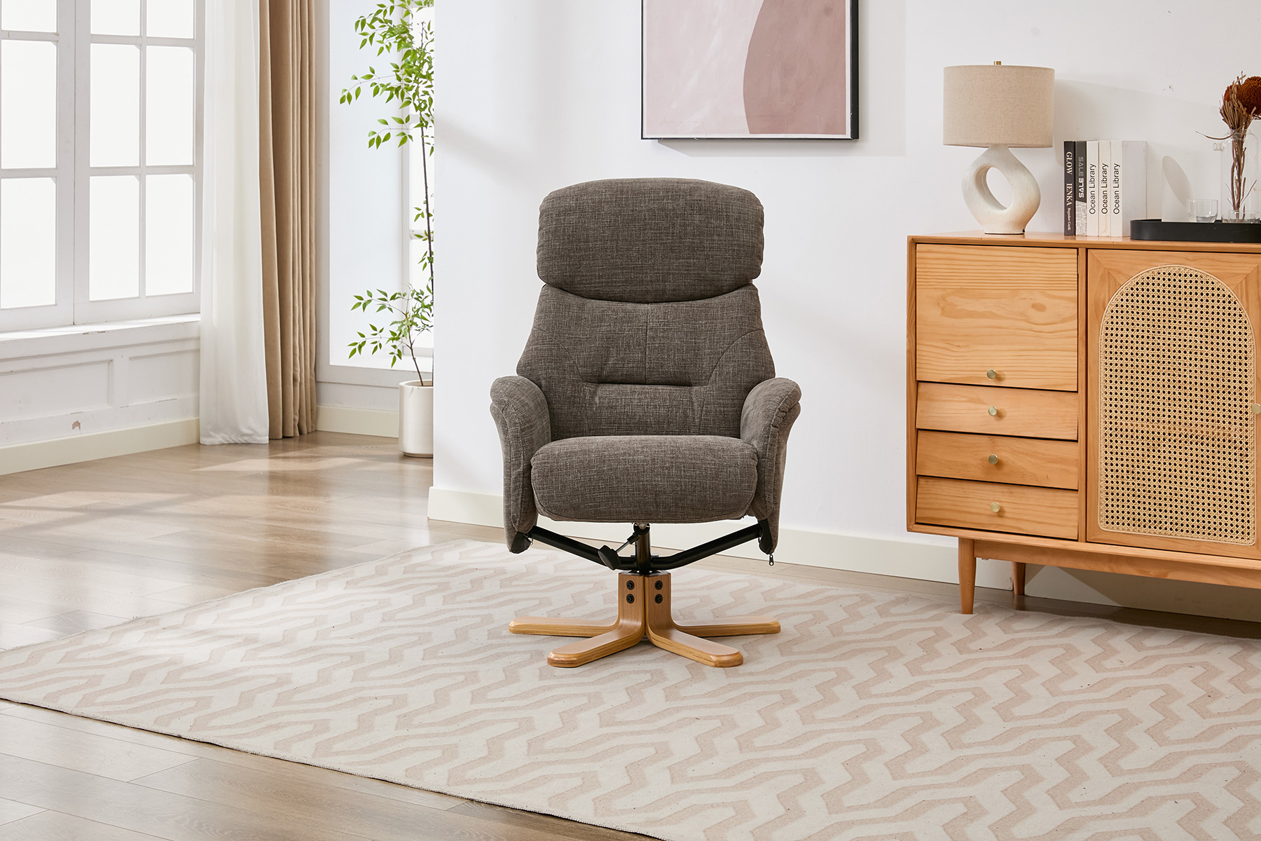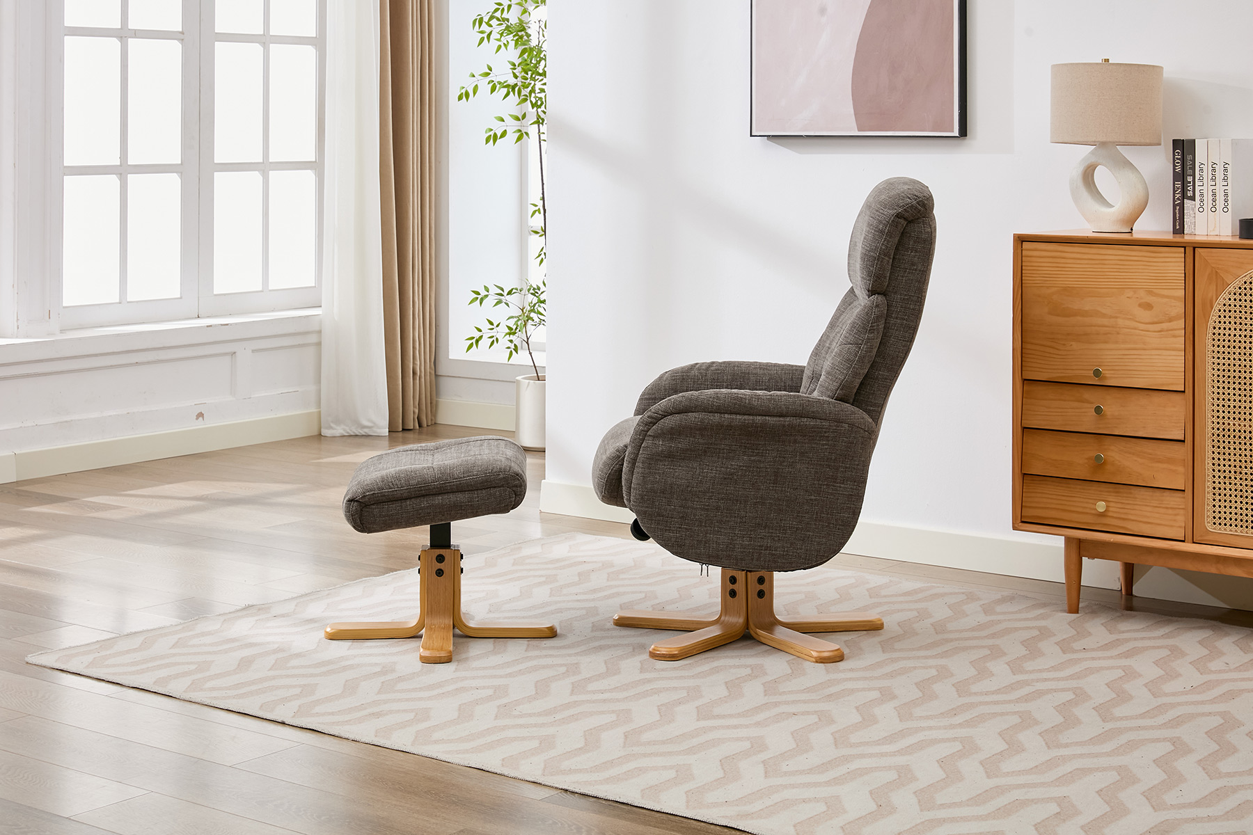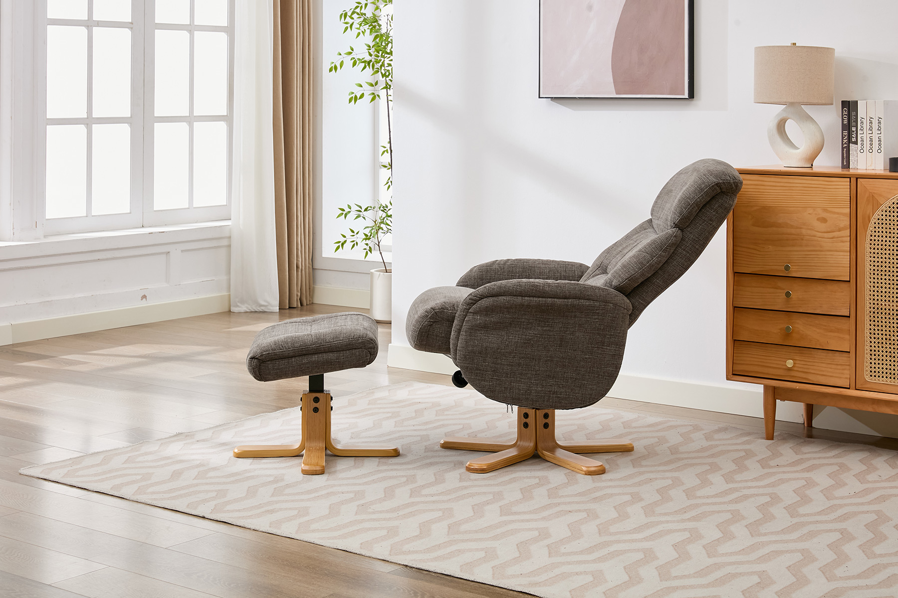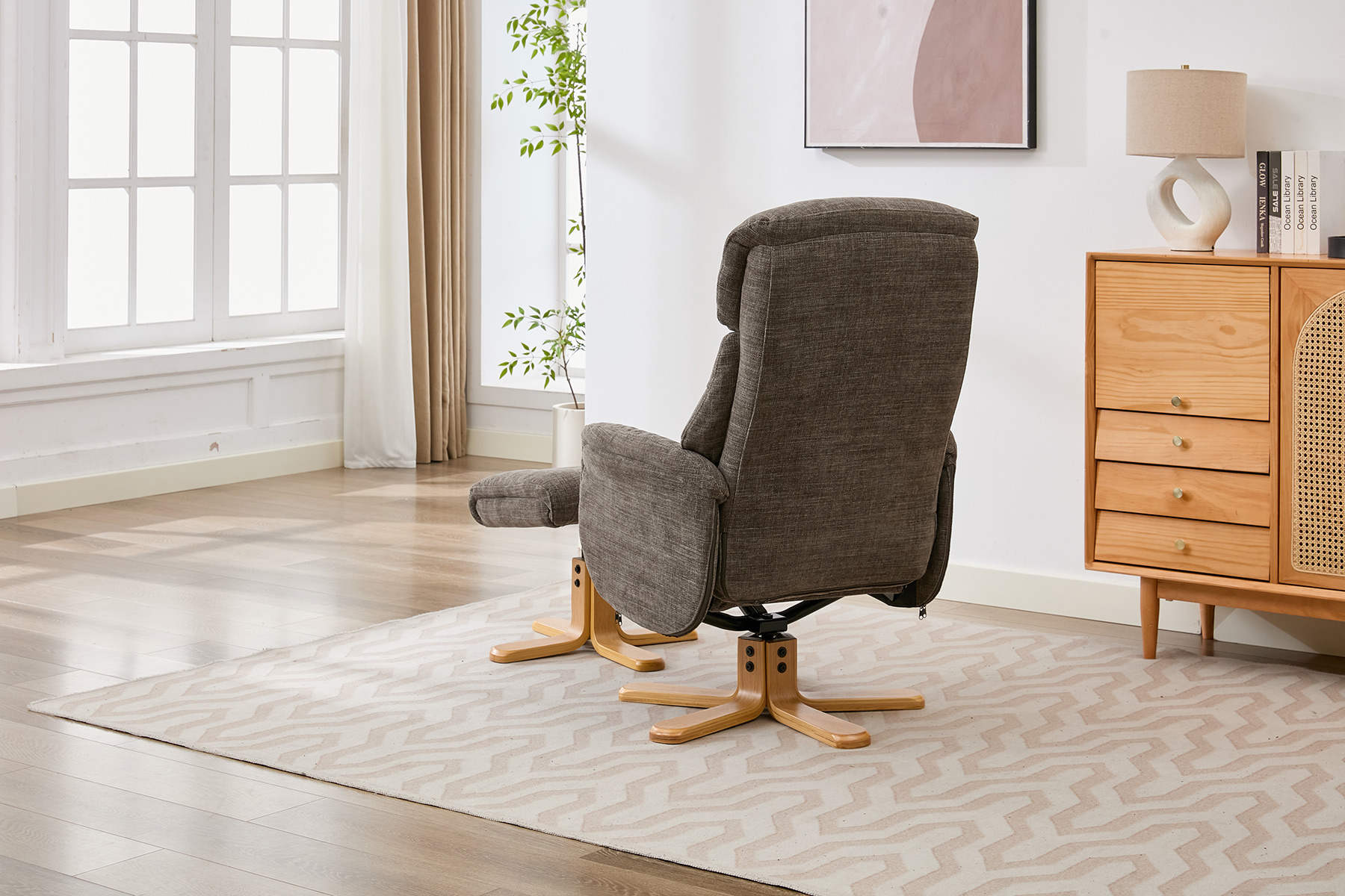 The Eden swivel recliner and footstool set from GFA Upholstery offers the perfect combination of comfort, style and contemporary design. Featuring attractive mid-oak legs that bring a natural warmth to your living space, this elegant recliner set is designed to complement modern interiors with ease.