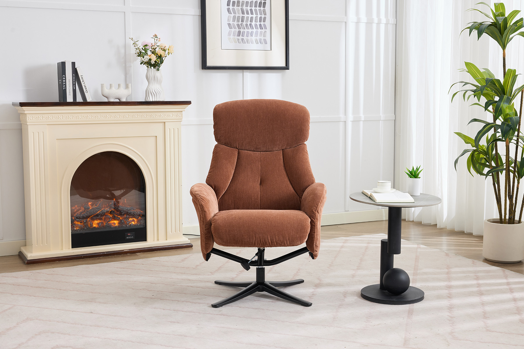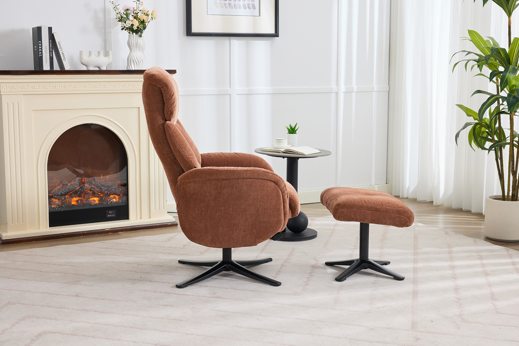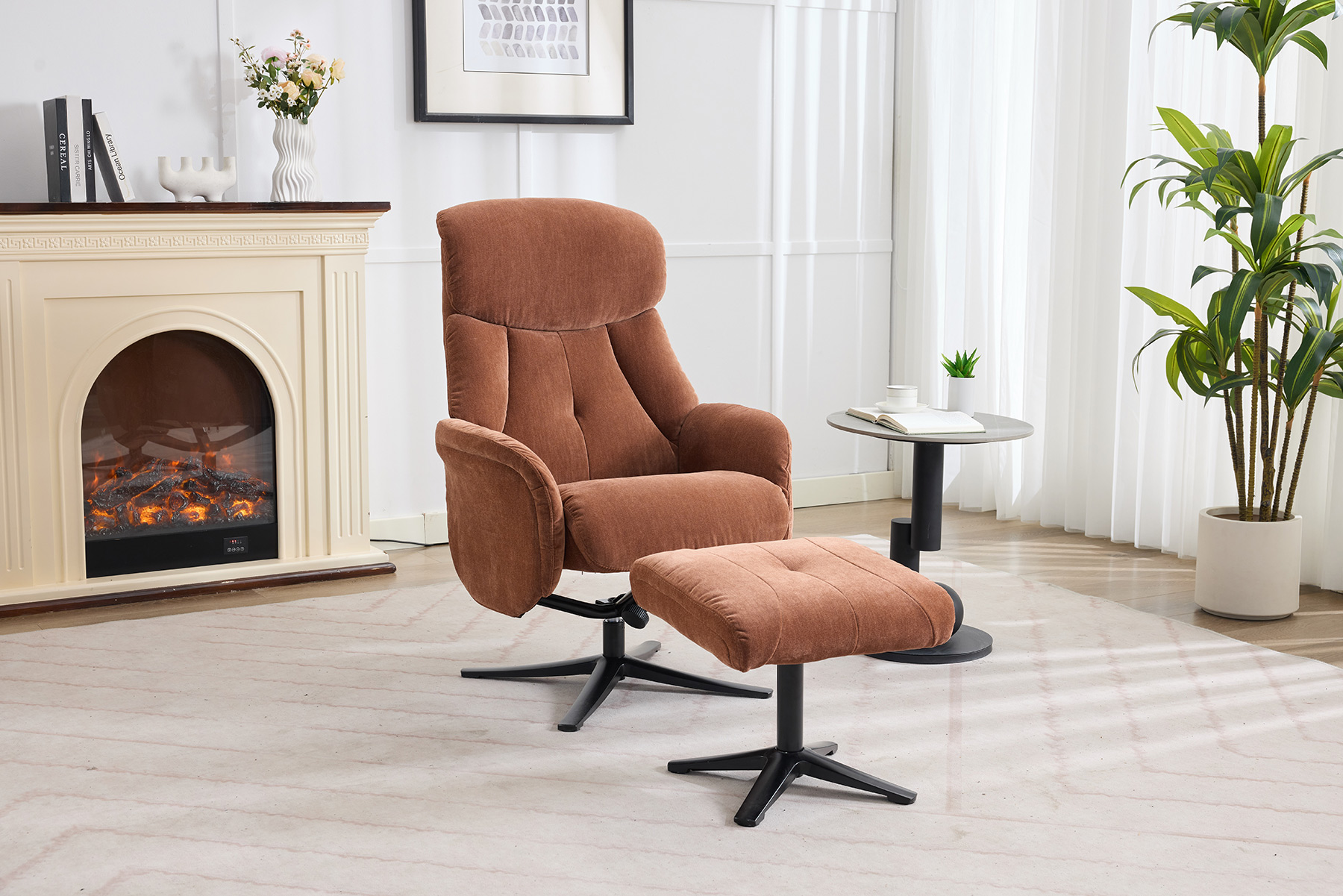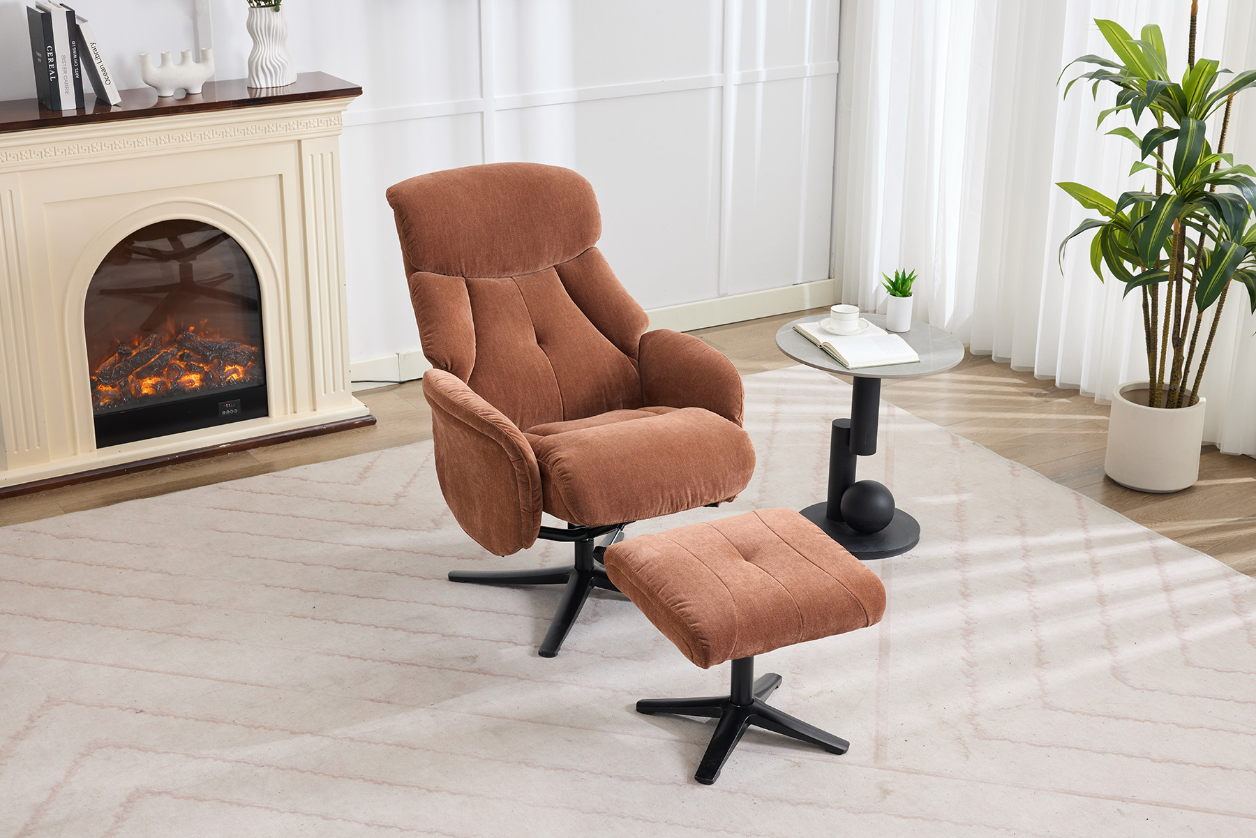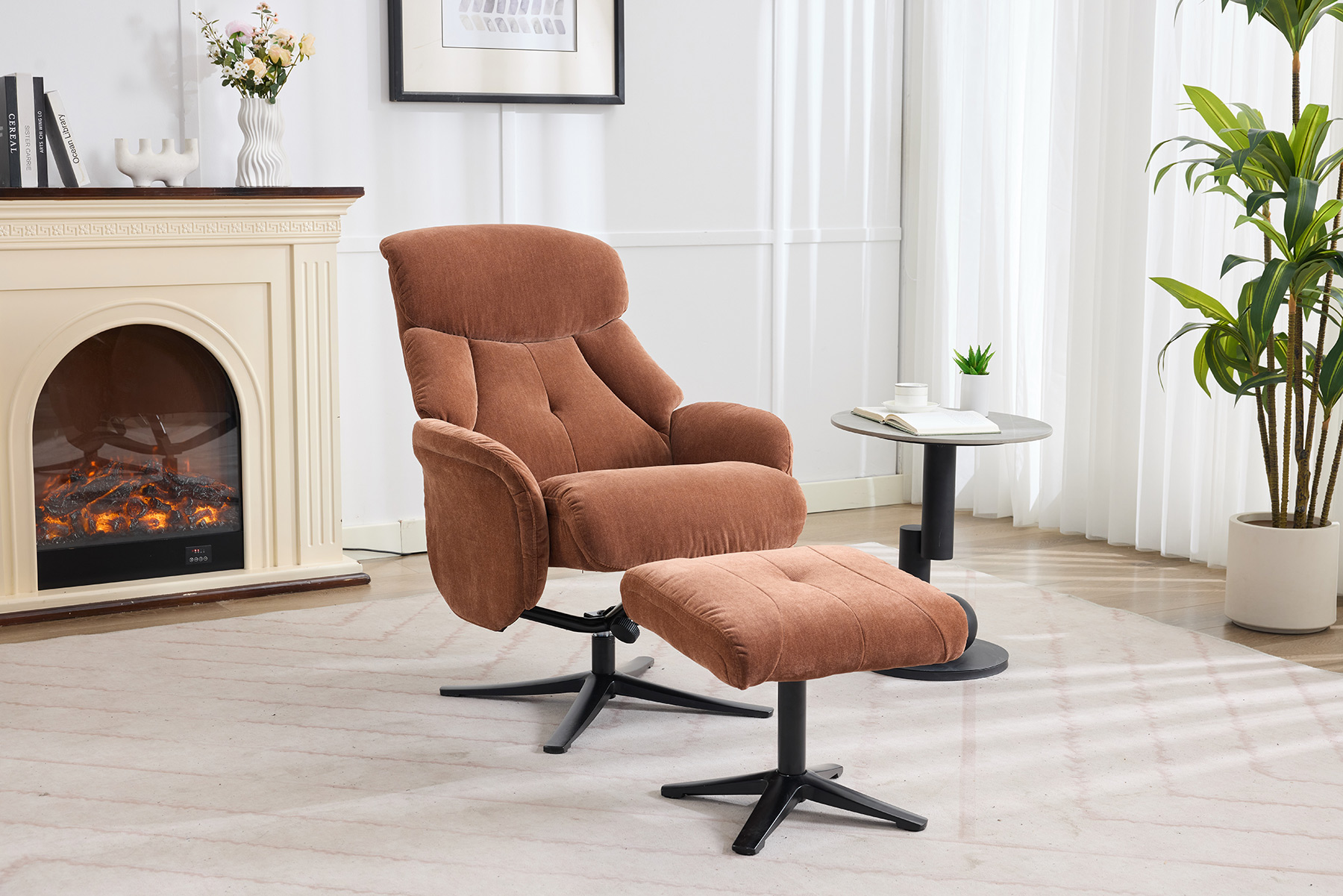 The Lucia swivel recliner and footstool set from GFA Upholstery combines contemporary style with outstanding comfort and everyday practicality. Upholstered in luxuriously soft caramel farbic fabric, this beautifully designed recliner adds a sophisticated touch to any modern living space.