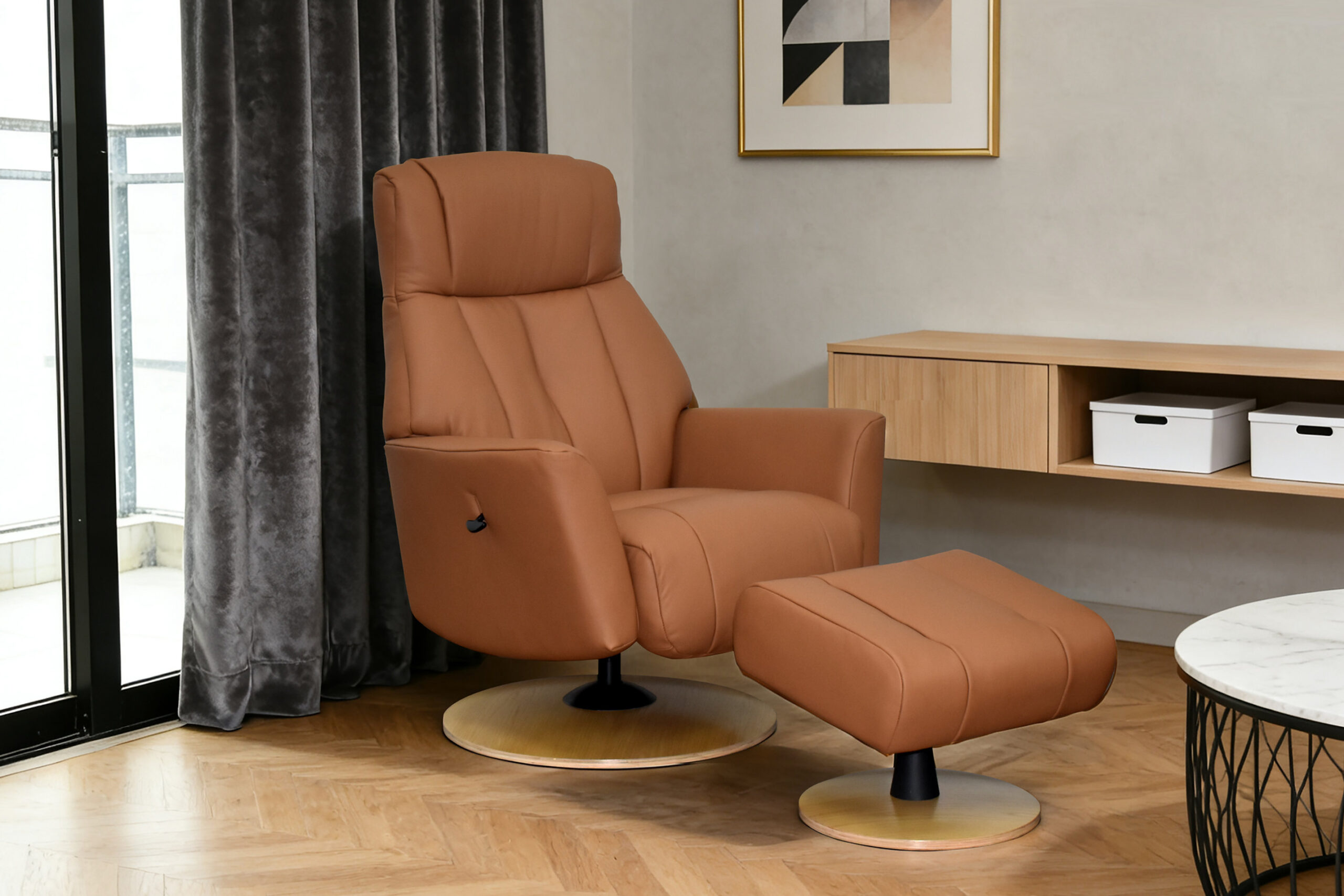 The Rowan swivel recliner and footstool from GFA Upholstery brings luxurious comfort and contemporary style to any living space. Upholstered in beautifully supple semi-aniline leather, this elegant recliner offers a premium seating experience with a refined finish.