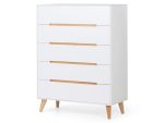 A stylish, retro-inspired chest with five large drawers in an immaculate matt white lacquered finish, with complementary tapered oak finish legs and recessed handles to provide easy opening. The sleek Scandinavian feel fits beautifully with any décor.
