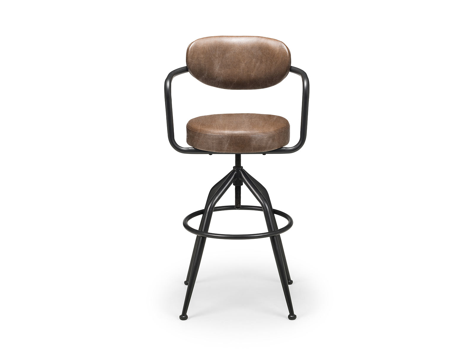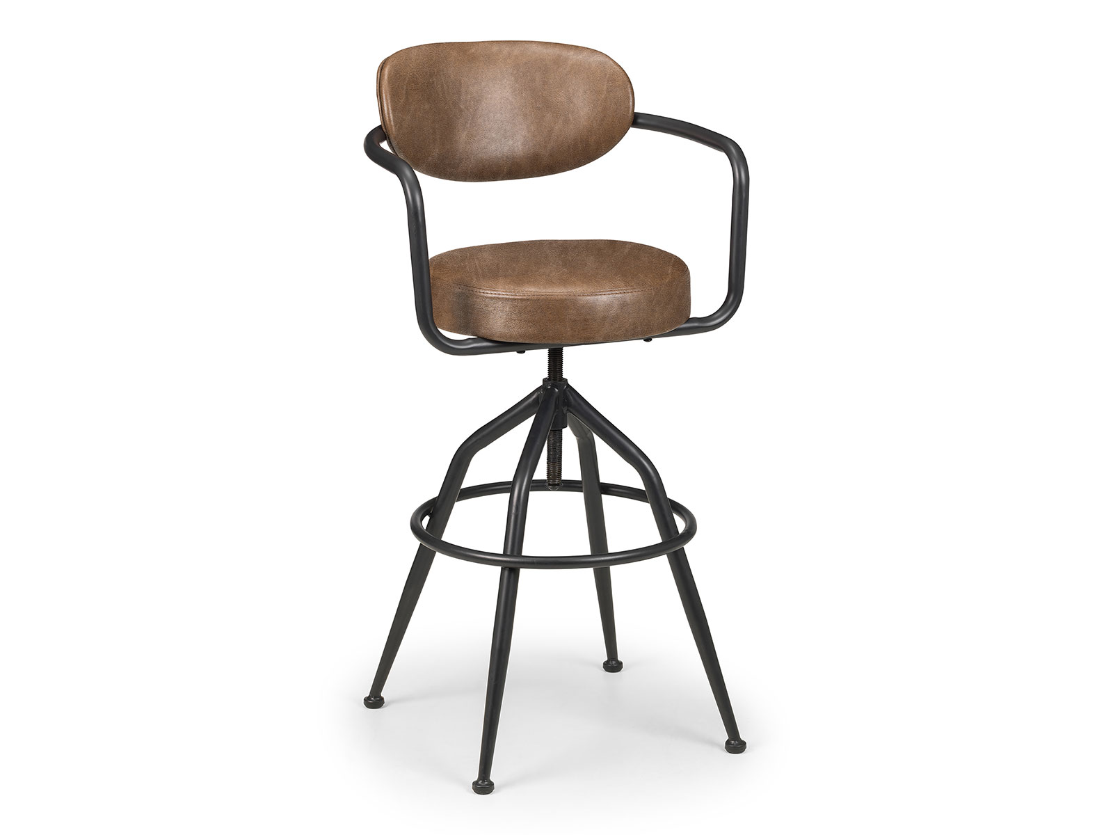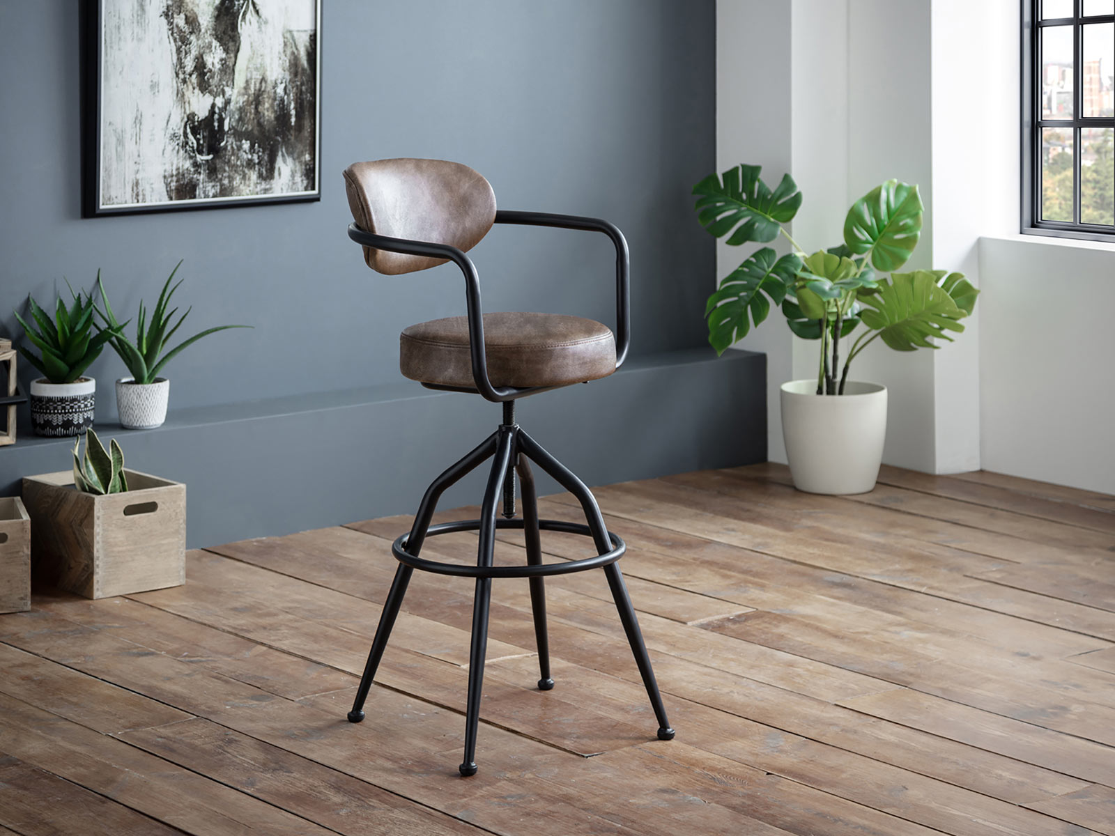 The iconic design of the Barbican Barstool is a piece of revived history, influenced by the statement barber chairs, a perfect eye-catching centrepiece for any room. Crafted from a black metal frame with a brown faux leather upholstered seat pad and back rest, this historic, industrial design excels in comfort.