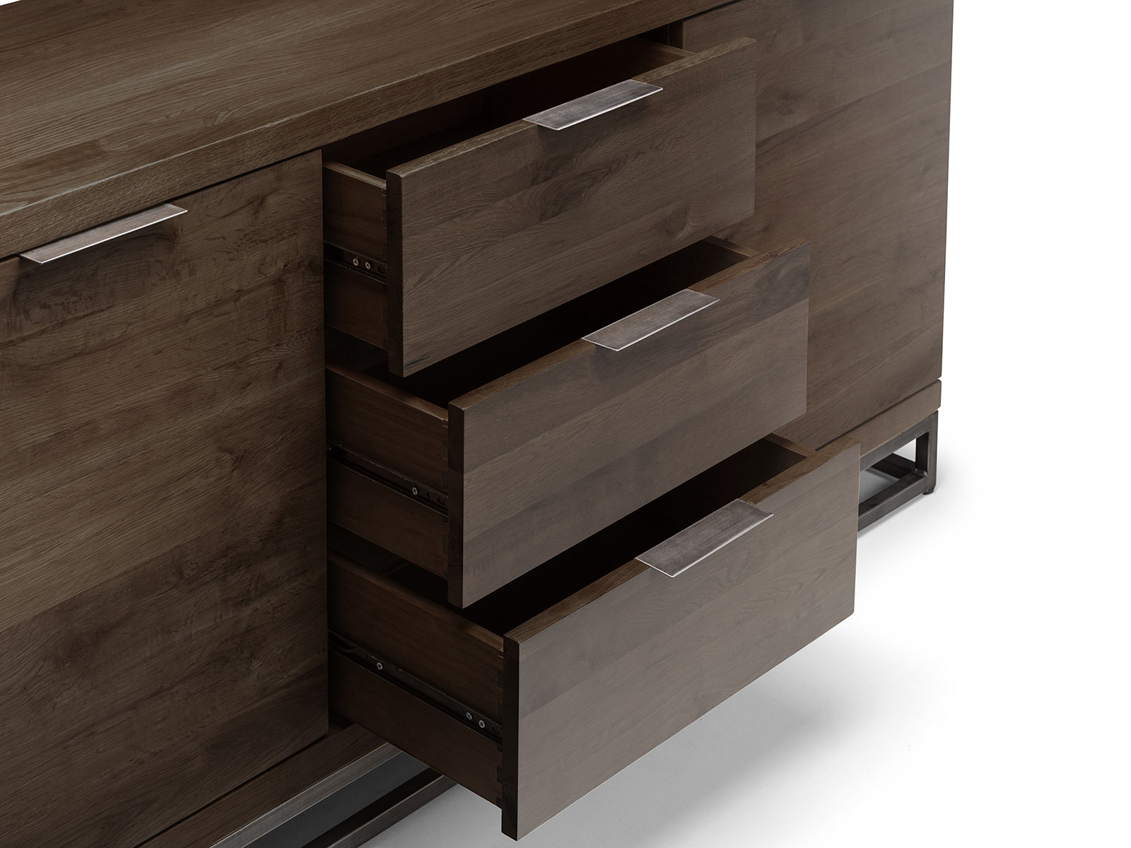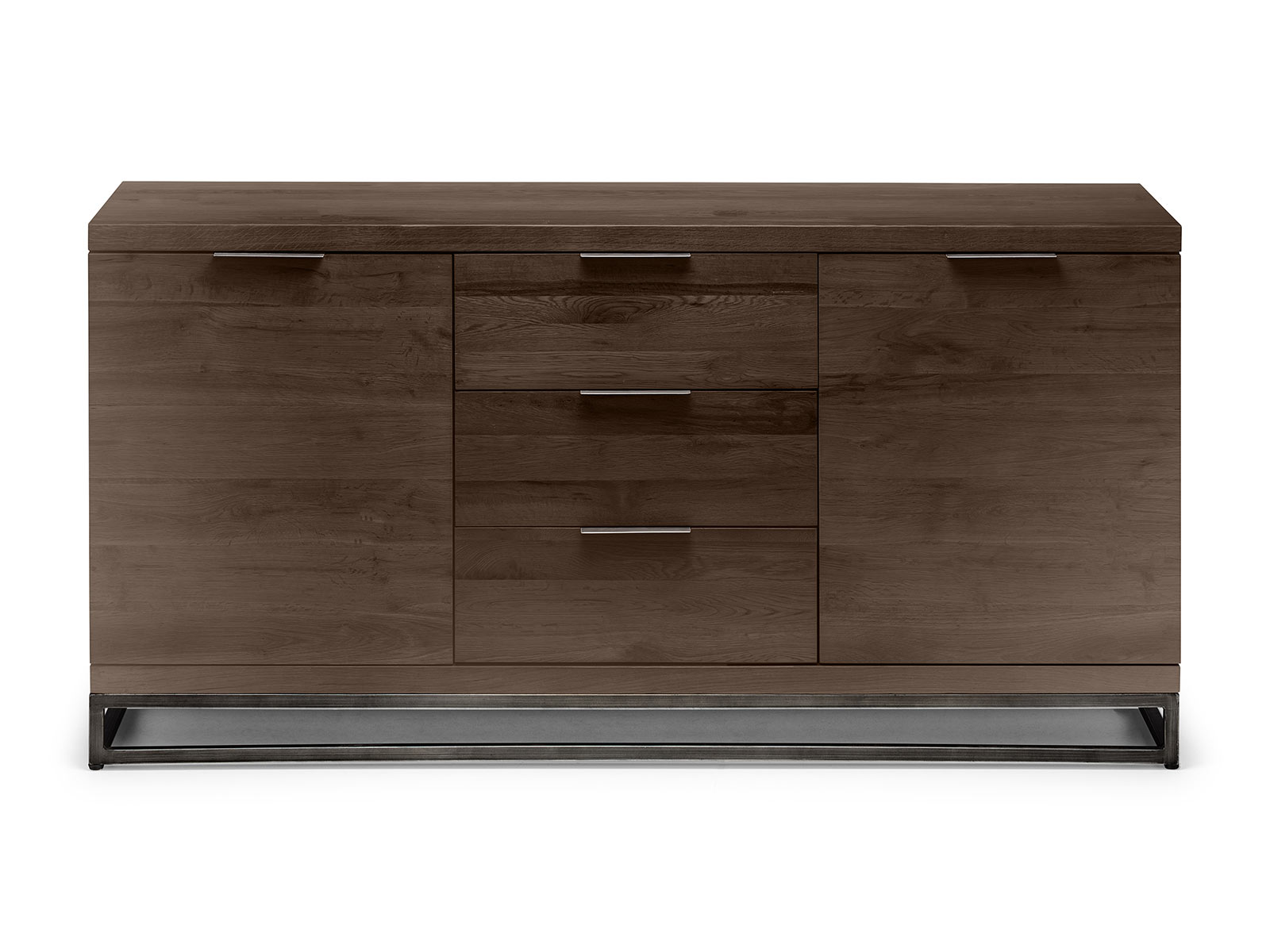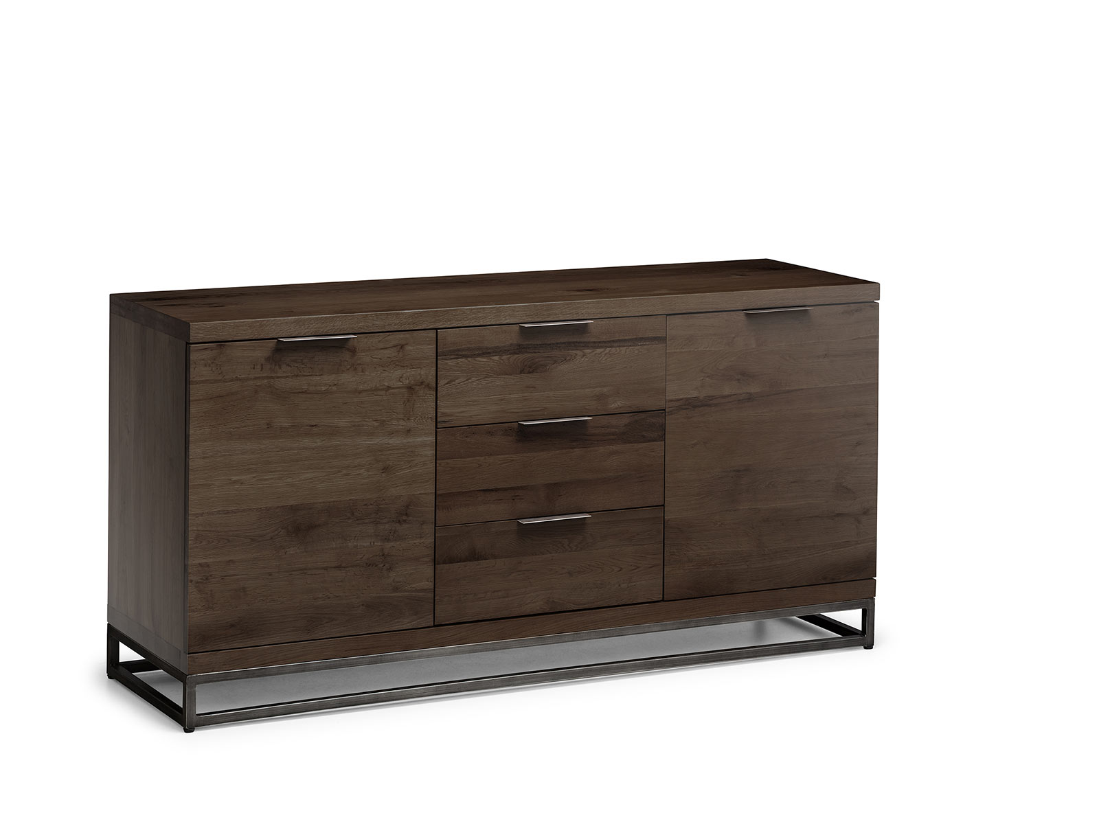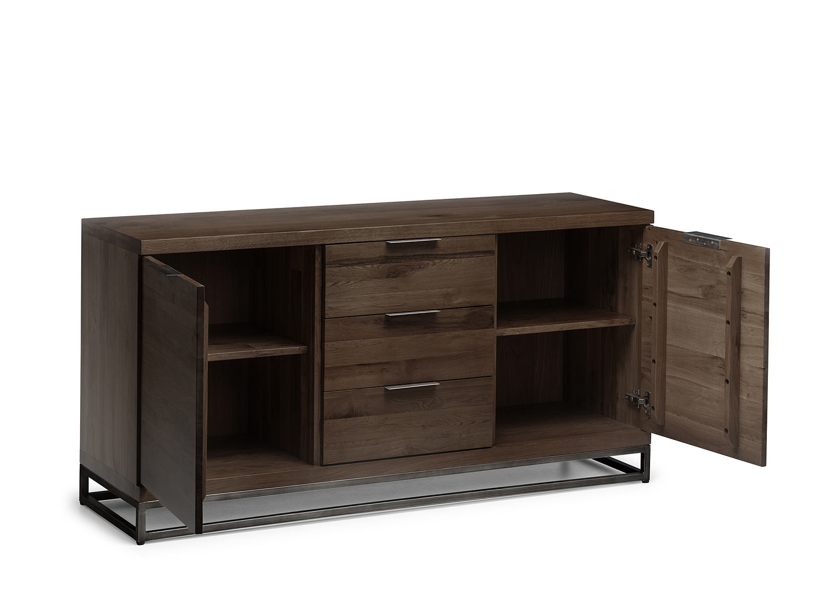 Made from solid oak, this Sideboard offers a rustic dark oak finish emphasising the stunning natural wood grain. The Brooklyn Sideboard offers a vintage edge featuring industrial style metal legs. Featuring two spacious cupboards with shelves, and three drawers, this sideboard is perfect for a wide range of modern décor. Part of the Julian Bowen Brooklyn Dining and Occasional Collection.