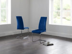 The modern Calabria Dining Chairs offering an elegant touch to any dining area. Upholstered in a choice of grey or blue rich velvet, with delicate diamond stitching upon a high, curved back rest for added comfort. Finished with a chrome plated cantilever frame, this dining chair is perfect for a wide range of Julian Bowen dining tables.