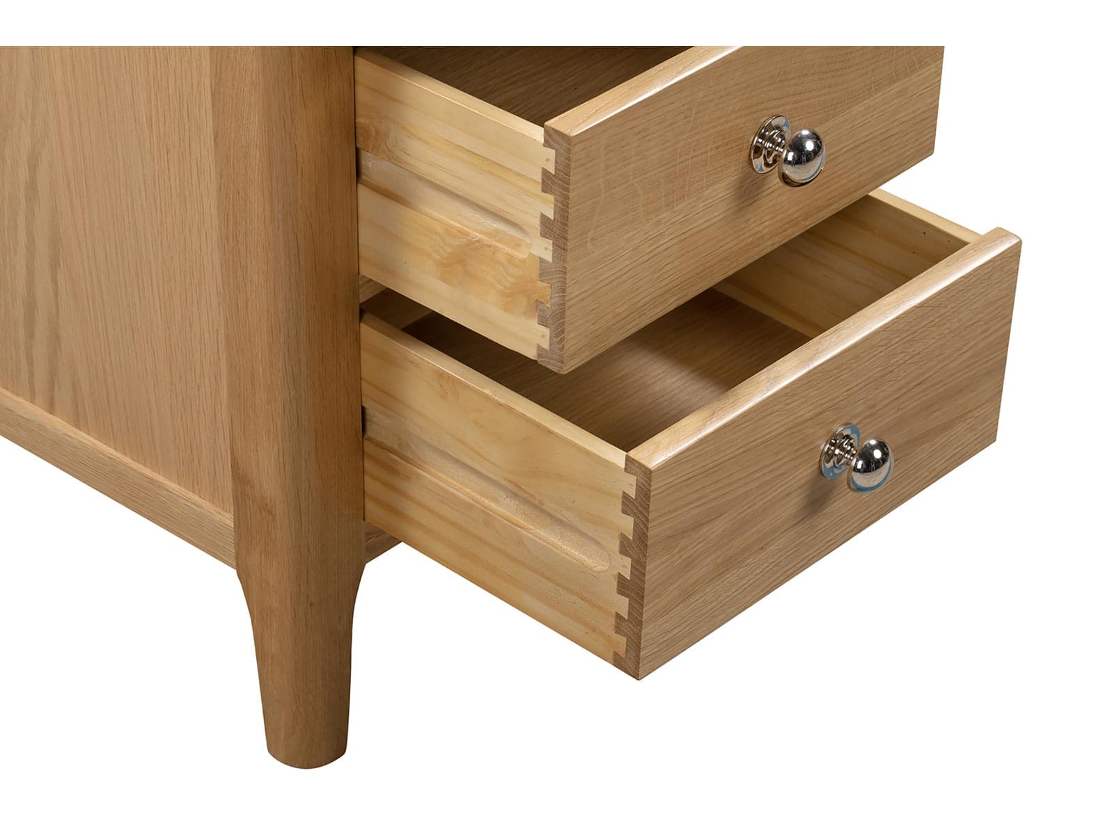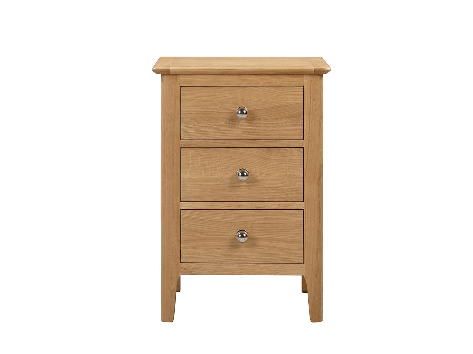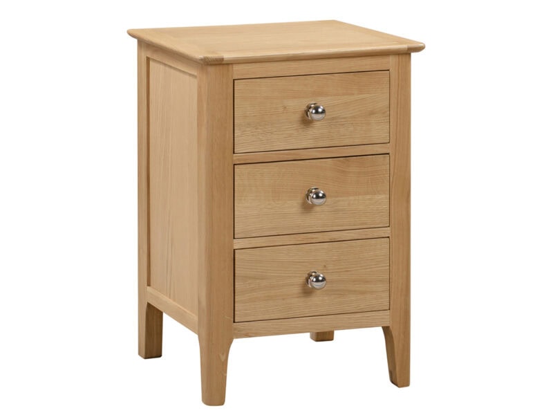Crafted from solid oak and oak veneers, the Cotswold 3 Drawer Bedside ensures lasting durability with its robust structure. Featuring 3 spacious drawers, ideal for keeping night-time necessities within arm?s reach, with additional space on top for a bedside lamp. This simple, yet elegant design is finished with a round silver knob, perfect for any traditional bedroom.