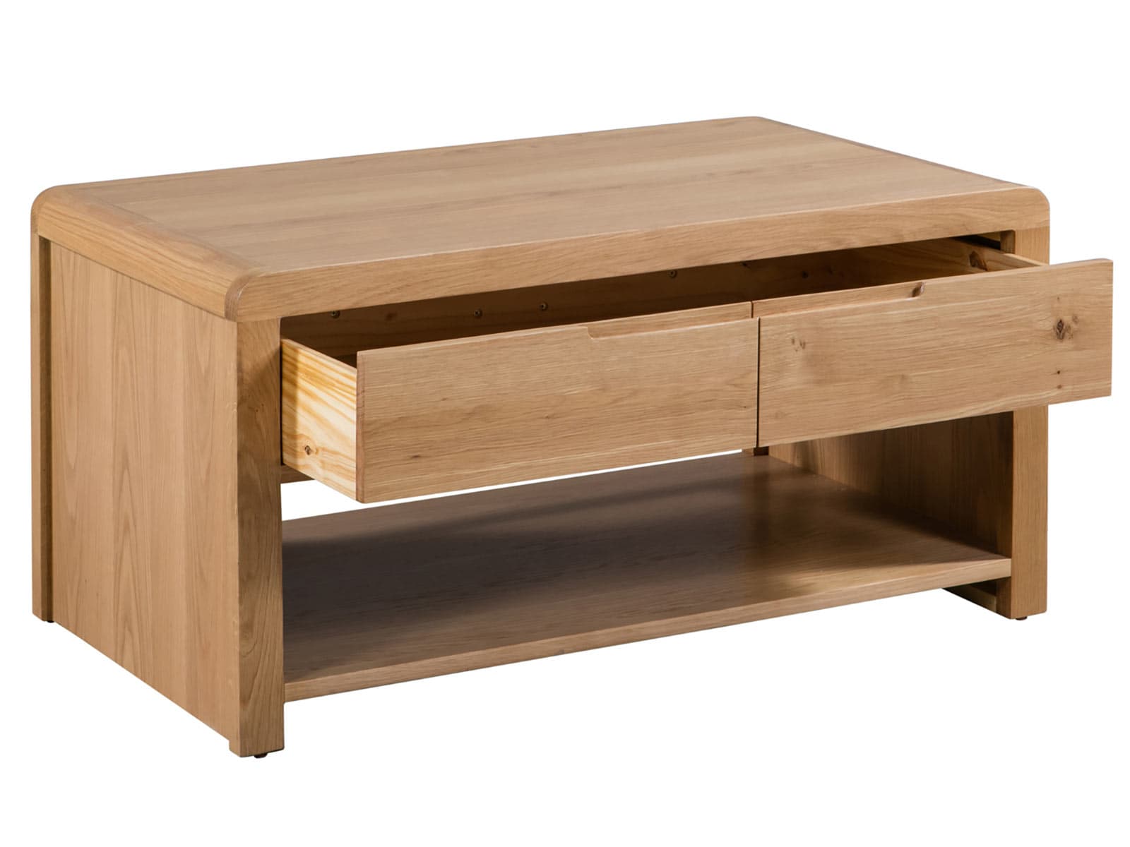 Crafted from solid oak and oak veneers, the Curve combines clean lines with a gentle curved ediging, adding a modern, retro feel to any dining area. The Curve Coffee Table features one large spacious drawer, with the vision of two on the outside, along with a shelf for extra storage. Part of the Julian Bowen Curve Dining and Occaional Collection